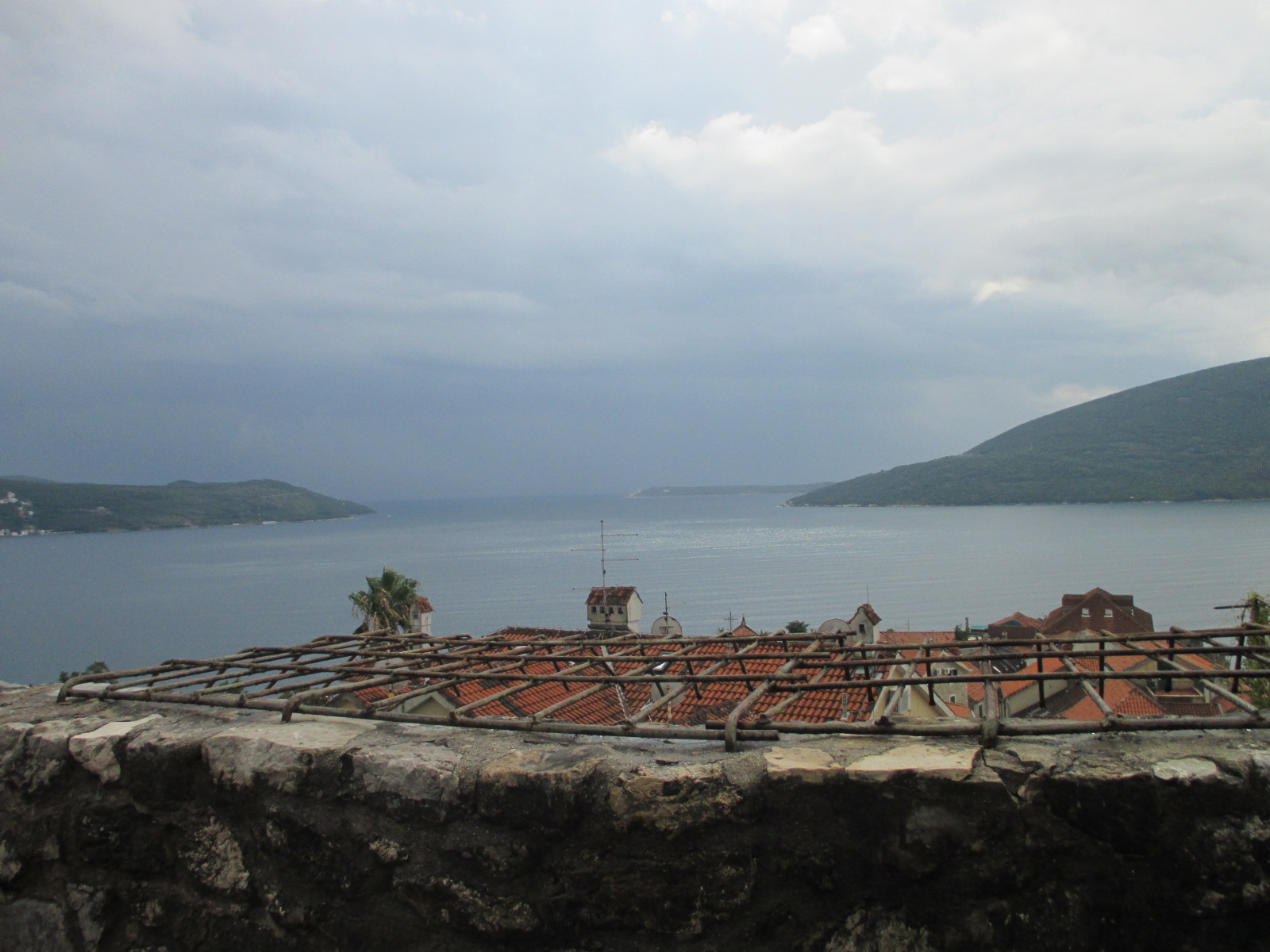 Il n’y a pas vraiment de trottoir, la descente est assez rapide. La vieille ville est petite mais très jolie, encore des ruelles à escaliers, la pluie s’est doucement remise à tomber, tant que c’était léger ça allait, mais quand c’est devenu plus fort, je me suis installée à la terrasse du Café René protégée par un auvent. Une fois le soleil revenu, je me suis attaquée à la forteresse Kanli Kula, ancienne prison, la montée est rude avec plus de 10 kilos sur le dos, mais la vue est superbe, sur la mer et les montagnes. Je n’y suis pas restée aussi longtemps que j’aurais voulu car le vent s’est levé et le tonnerre s’est mis à gronder. Être en hauteur quand l’orage approche et qu’il y a un vent à décorner les bœufs, ce n’est peut-être pas ce qu’il y a de mieux à faire.