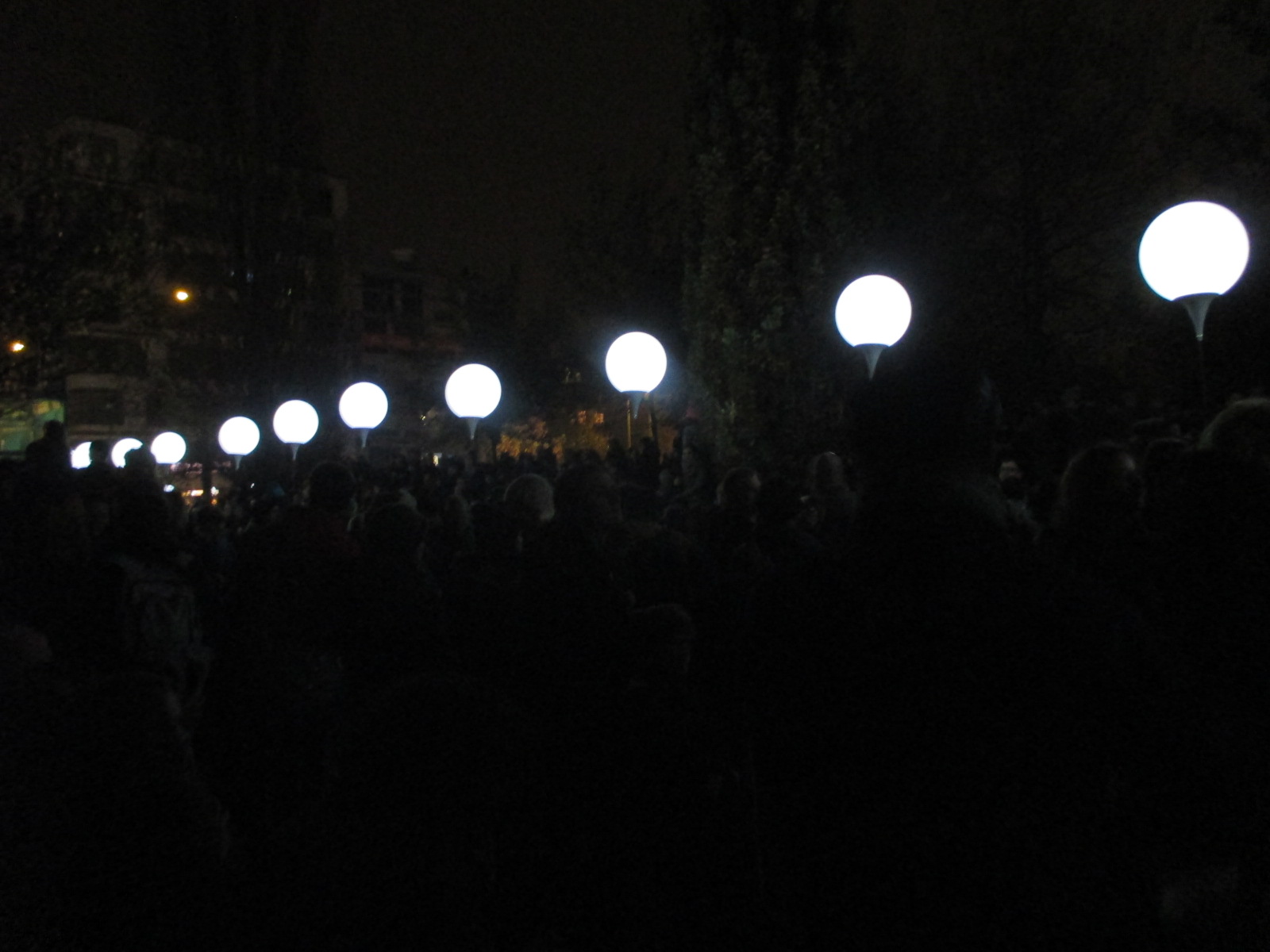 Le week-end des 8-9 novembre avaient lieu les festivités pour le 25e anniversaire de la Chute du Mur. Dès jeudi les poteaux portant les ballons ont commencé à fleurir le long de l’ancienne frontière, l’allumage a eu lieu vendredi.