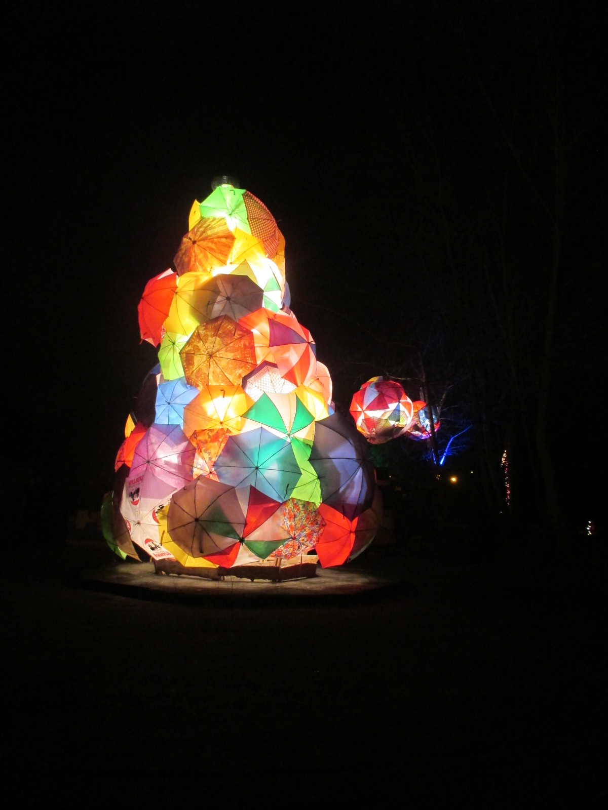 L’entrée est 2€50, cher donné j’avoue, bien sûr les attractions ne fonctionnent pas, on n’a pas non plus accès à la totalité du parc, c’est très petit. Cela dit, c’est une atmosphère particulière, au cœur de la forêt, peu de lumière, plus de stands pour boire et manger que pour acheter des cadeaux de Noël. Et le sapin est une composition de parapluie éclairés, original.