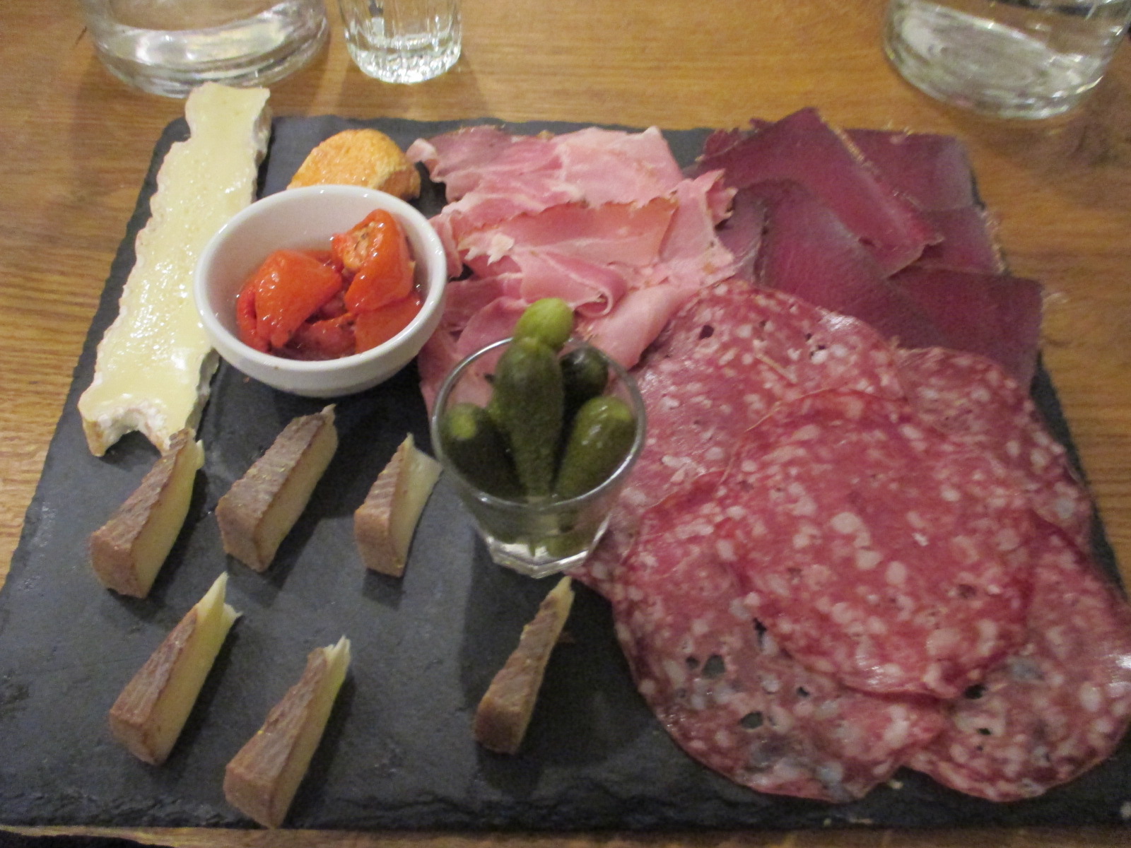 C’est assez petit, il est donc conseillé de réserver si vous êtes nombreux. Malheureusement, la plupart des plats chauds n’étaient plus dispo (je voulais une tartiflette snif, tant pis j’y retournerai en hiver) car la carte va bientôt changer donc je me suis rabattue sur une planche fromage/charcuterie. Viande de grison, rosette, jambon blanc et plusieurs fromages. Des ingrédients de qualité ! Mes papilles étaient ravies, notamment un délicieux fromage à la liqueur de noix, une belle découverte ! Certains ont pris la raclette (version française avec charcuterie donc malheureusement pas idéal pour les végétariens), j’ai goûté et le fromage est là aussi très bon. Les desserts aussi sont à ne pas manquer, j’ai pris une tarte chocolat-abricot, un vrai délice. Bref, la qualité est là, pas de doute.