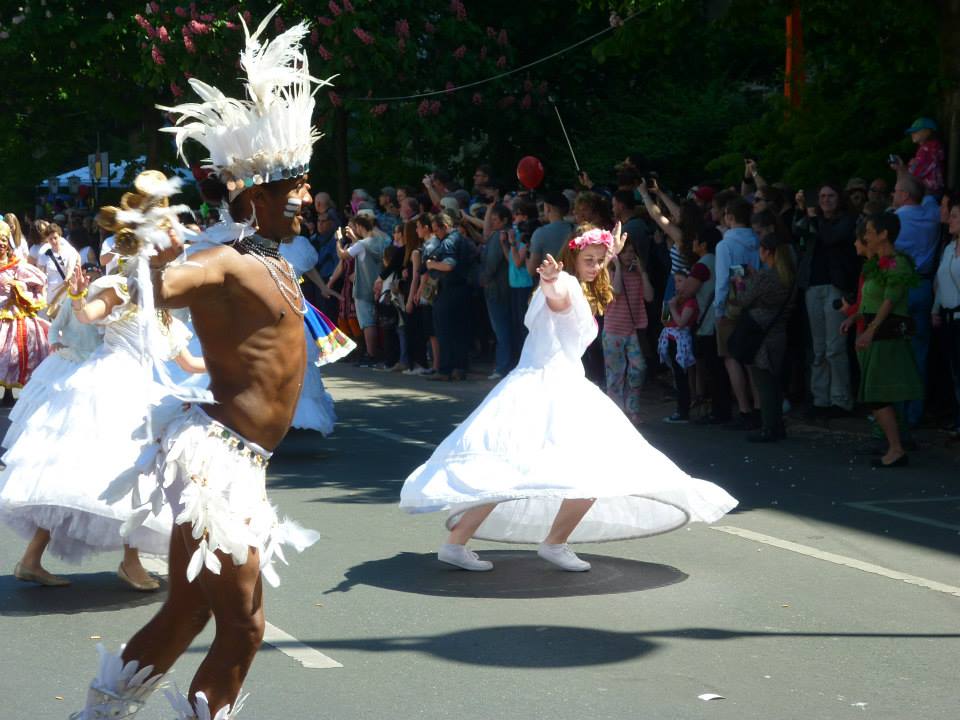 Il y a une bande d’herbe au milieu de la route où passe le défilé, en attendant que ça commence, on s’est assises là, au soleil avec un petit cocktail, en espérant être du bon côté… Eh bien quand ça a commencé on s’est rendues compte de notre erreur, la parade passait de l’autre côté mais on a réussi à se faufiler pour bien voir. On n’a pas assisté à TOUTE la parade, mais bien deux bonnes heures déjà, l’Amérique du Sud bien représentée, samba, salsa, danses péruvienne,… Entre autres bien sûr. Très coloré, très joyeux, très dansant, bonne ambiance, tout dans la joie et la bonne humeur. Au bout d’un moment, à force de rester debout on a décidé de remonter vers Hermanplatz et on pouvait voir assez bien le défilé. J’avais un peu peur que la foule soit trop étouffante mais ça restait supportable.