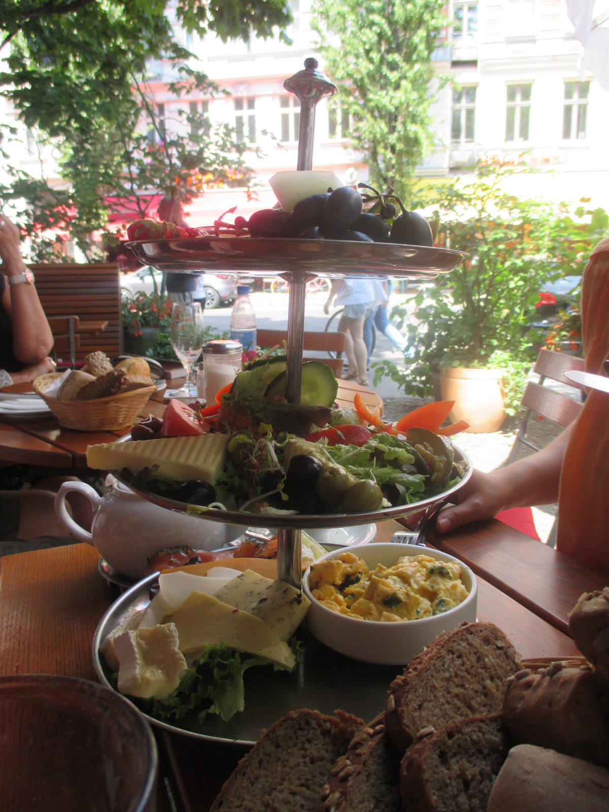 Anna Blume est une boutique de fleurs à Prenzlauer Berg, pas loin de Kulturbrauerei, mais c’est aussi un café dont le petit-déjeuner est très connu et reconnu, souvent listé dans les tops 10 des brunchs à Berlin. J’y suis récemment enfin allée. Dimanche presque midi, 30°C, une terrasse ombragée est évidemment vite prise d’assaut, on a dû attendre 15-20 minutes avant d’avoir une table, une partie du groupe ayant 30 minutes de retard cela ne nous a pas posé de problème, mais cela vaut tout de même le coup d’attendre.