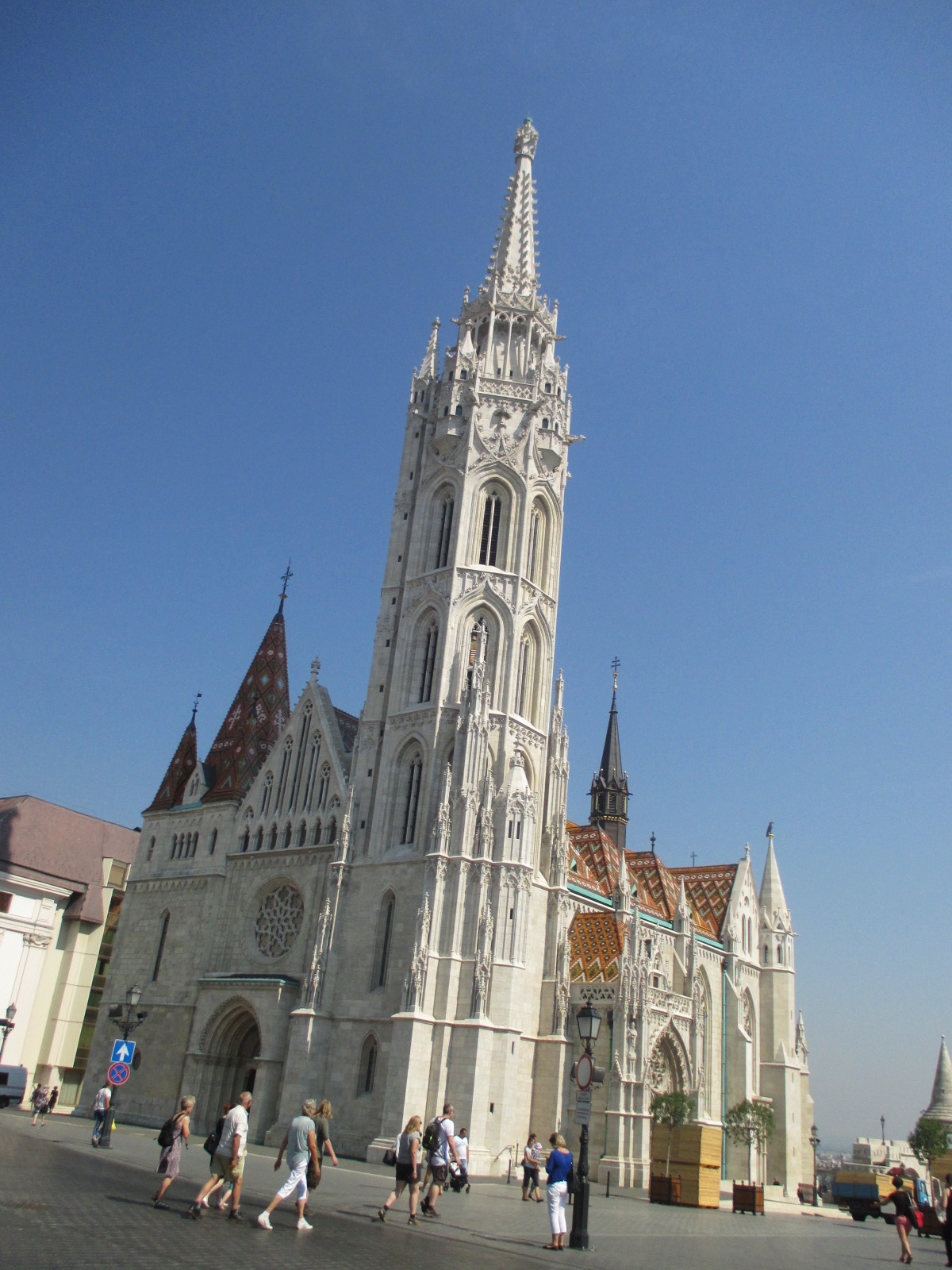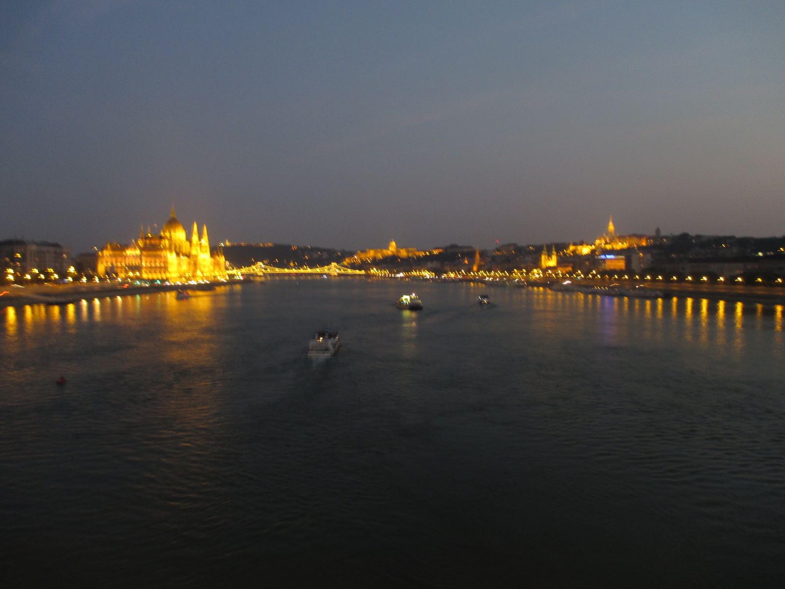 Bref, après ça je me mets en route, je prends le tram jusqu’au pont Margit et traverse le Danube à pied (enfin sur le pont hein), la vue est superbe. Je commence à déambuler dans Buda, sous un soleil déjà de plomb, puis je me pose 2 secondes pour étudier le plan et les suggestions de visite et prends la route du quartier du château de Buda, un peu en hauteur, la vue sur le Danube et Pest (l’autre côté de la ville) est magnifique. Je me promène un peu et me pose à un bar sur les remparts du Bastion des Pêcheurs. Je vois qu’ils ont des parasols donc je demande au serveur une place à l’ombre, il me répond qu’il ne peut pas me garantir d’ombre, on est en août, mais en décembre… Bon, ben je reviendrai en décembre, je réponds, et lui de me rétorquer qu’il fait froid. Et alors ? 🙂 Bref, je m’installe sous un parasol, près d’un ventilateur (oui, un ventilateur en extérieur) et profite de la vue en bouquinant et en sirotant un cocktail. Après quoi je continue ma balade avant de grignoter un morceau dans une guinguette où le serveur s’extasie que j’arrive à répéter le nom du plat… Oui, le hongrois c’est difficile, mais deux mots à répéter direct c’est pas trop dur… Enfin bref. 🙂