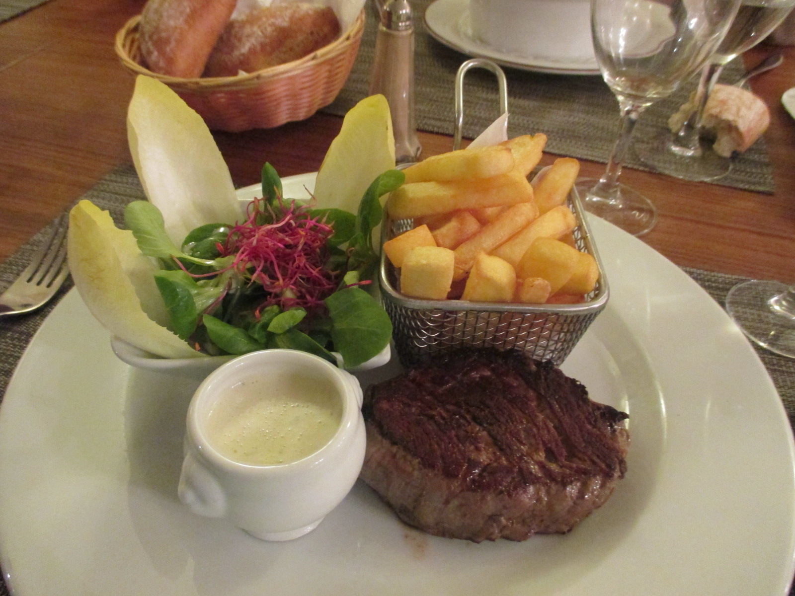 Le cadre un peu rustique, agréable, bel accueil, personnel sympathique. Le menu est très alléchant et propose des formules différentes à des tarifs très raisonnables. La majorité d’entre nous a pris le menu Gourmet, le plus cher mais avec entrée, plat, fromage, dessert pour seulement 35€. Le foie gras maison a eu un grand succès à notre tablée, le croustillant de St Jacques et le saumon fumé ont également été très appréciés. Pour le plat, j’ai opté pour un filet de bœuf avec sauce au roquefort, la viande était exquise, cuisinée comme demandée (bien saignante), très tendre, très bonne sauce et frites. Les autres convives ont apprécié les rognons, les ravioles d’écrevisse et un autre plat de poisson. Petite assiette de fromage, avec notamment du munster, pas trop fort mais très bon. En dessert, le café gourmand avait l’air sympa, tout comme la crème brûlée et les profiteroles, j’ai pris la dame blanche, je n’ai pas réussi à la finir mais elle était bonne.