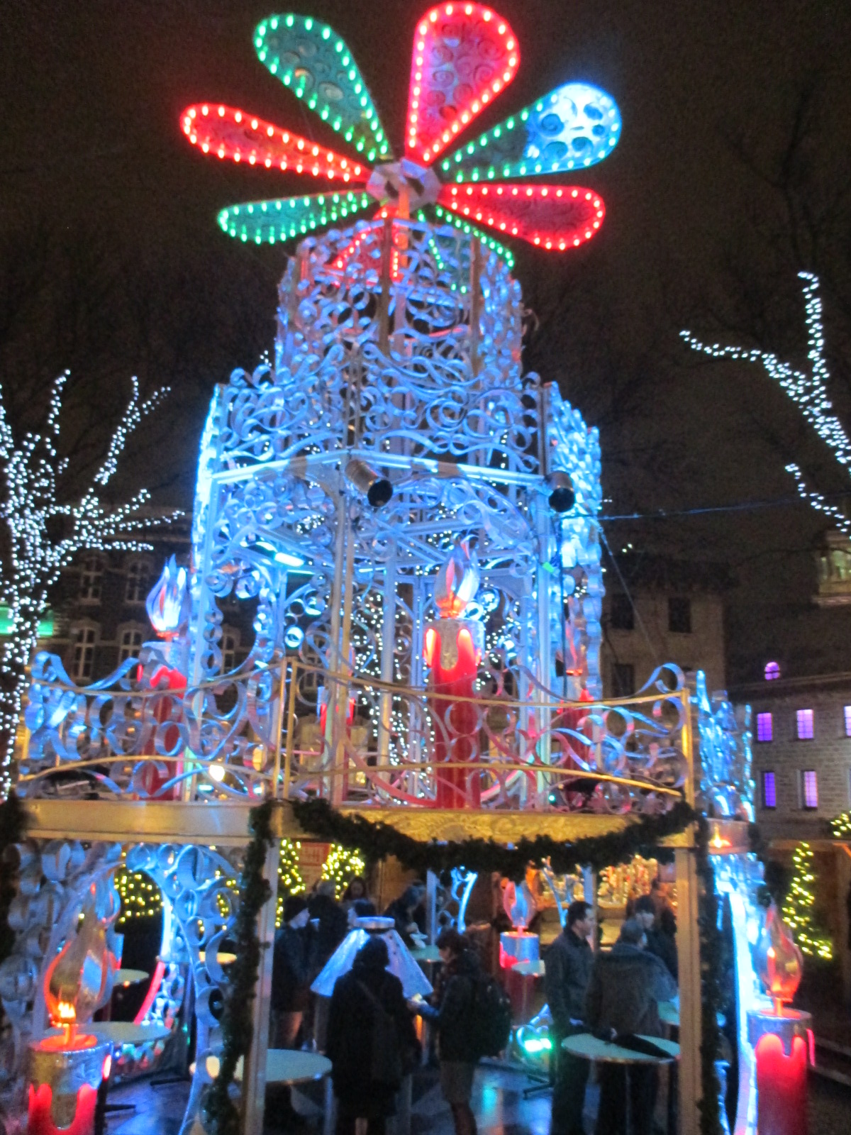 Hier, après m’être rassasiée, je suis retournée à l’hôtel finir de m’installer. À la nuit tombée, je suis allée visiter le marché de Noël allemand dans le Vieux Québec, très mignon et avec de jolis éclairages, de la musique allemande de Noël et des currywurst hors de prix, aussi des bretzels, du pain d’épices, du strudel, si jamais je suis en manque de l’Allemagne.:-D Sur un stand, un mec vendait des bijoux faits avec du cuivre du château Frontenac, récupéré lors des dernières rénovations, il était super sympa, on a pas mal discuté. Il était surpris quand j’ai dit que j’arrivais d’Allemagne, parce que j’ai pas d’accent allemand… euh oui c’est vrai, hé hé. Donc j’explique que je suis française mais je vis à Berlin. J’ai ensuite exploré un peu les environs, dont le château Frontenac, de nuit, avec le brouillard, les lumières et personne dans les rues, ça donnait une atmosphère fantasmagorique. Après cette petite balade nocturne, je suis retournée vite fait à l’hôtel.