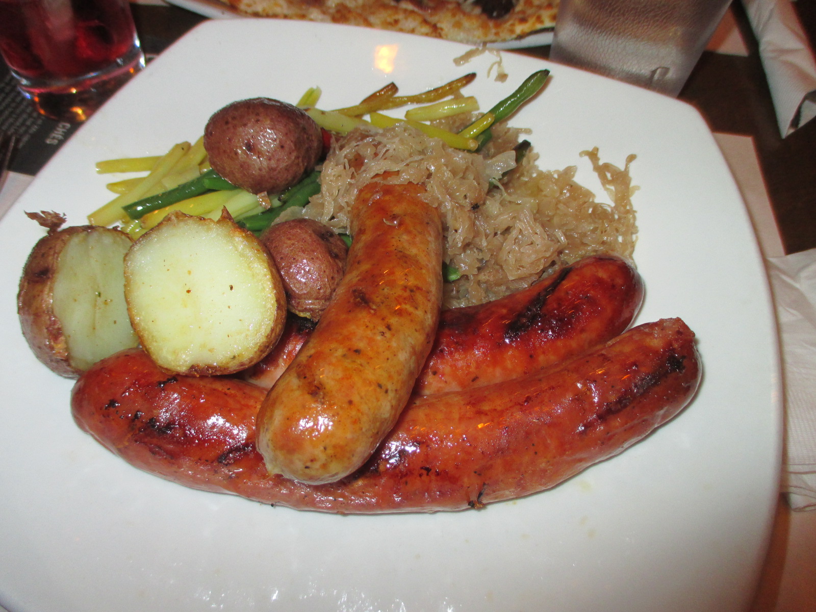 La filiale est présente au Canada et nous sommes allées dans le restaurant de la rue Saint-Denis pour le souper lors de l’enterrement vie de jeune fille. Gros plus pour moi : une multitude d’écrans permet de suivre les matchs des Canadiens. Honnêtement, je suis sceptique quant à leurs flammkuchen. Déjà, ils ne proposent pas la classique (crème, lardons, oignons) mais des recettes trop originales à mon goût. De plus, ils les servent sur assiettes normales non découpées, la vrai flamm’ se sert sur planche en bois et prédécoupée, c’est un sacrilège de la manger avec des couverts ! Cela dit, celles qui en ont prises étaient satisfaites, mais quand il s’agit des spécialités culinaires, j’ai tendance à être un peu extrémiste ! ^^ J’ai opté pour un très bon pain à l’ail gratiné et de succulentes (et énormes) saucisses accompagnées de choucroute et patates. Le service est excellent, le personnel super sympa, ils ont même offert le dessert à la future mariée. De plus, ils ont apparemment de très bonnes bières.