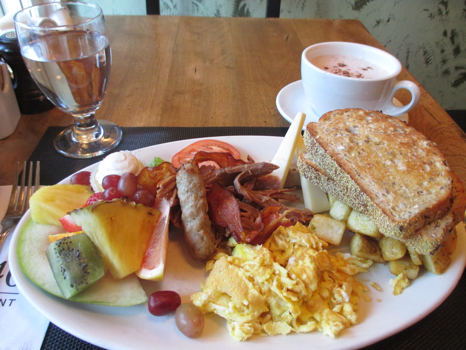 Une autre bonne adresse pour petit-déjeuner dans le Vieux Québec est le restaurant 1640, aussi face à Frontenac. L’endroit offre un cadre agréable avec un personnel très accueillant et sympathique. Leur assiette brunch est excellente, de quoi bien se caler pour la journée. Toasts beurrés, œufs, saucisse, jambon, bacon, pommes de terre rissolées, fruits et cupcake. Leur chocolat chaud est aussi pas mal du tout.