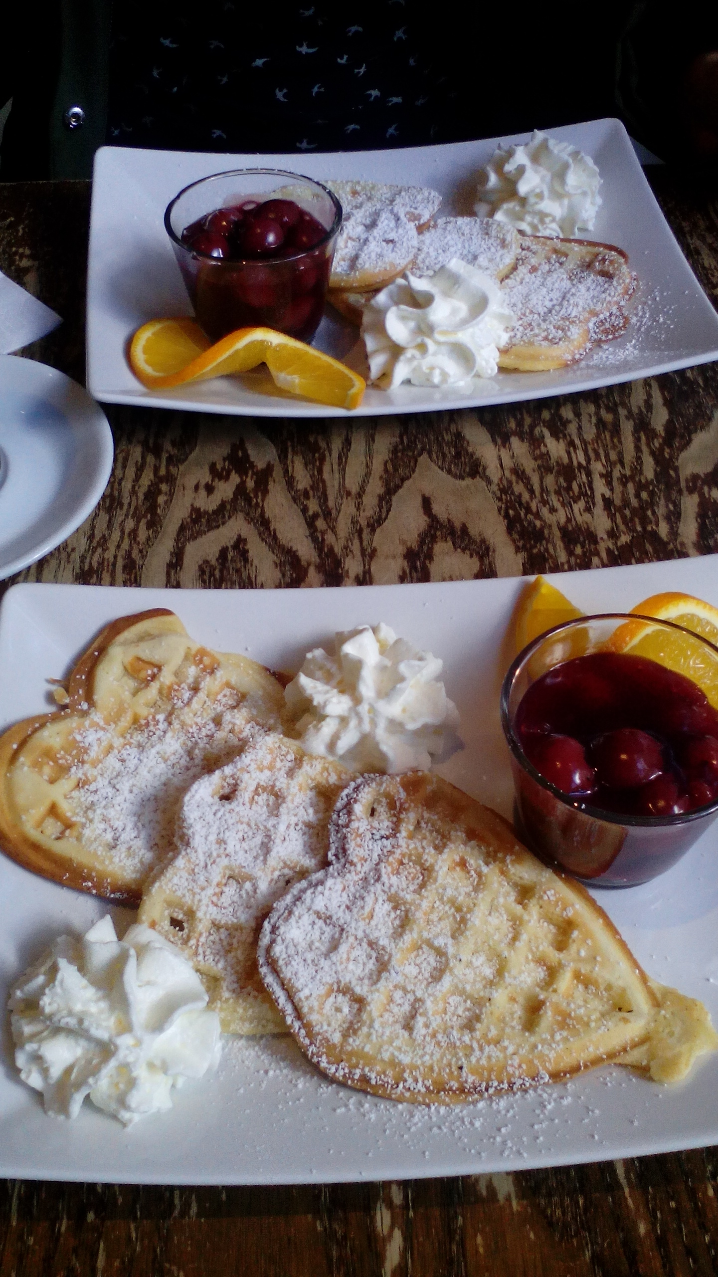 Un jour, avec une amie nous sommes allées nous balader du côté de Schöneberg, sur le chemin du retour nous nous sommes arrêtées dans le Bergmankiez pour déjeuner, une expérience râtée qui nous a laissé sur notre faim. La rue Bergmannstraße étant remplie de cafés sympa, nous nous sommes offerts un bon dessert au Kaffee am Meer. Les gâteaux avaient l’air bien appétissants, les plateaux petit-déjeuner que l’on a vus passer avaient l’air sympa, le menu était bien alléchant. Au final, nous avons toutes les deux pris des gaufres avec cerises chaudes et chantilly.