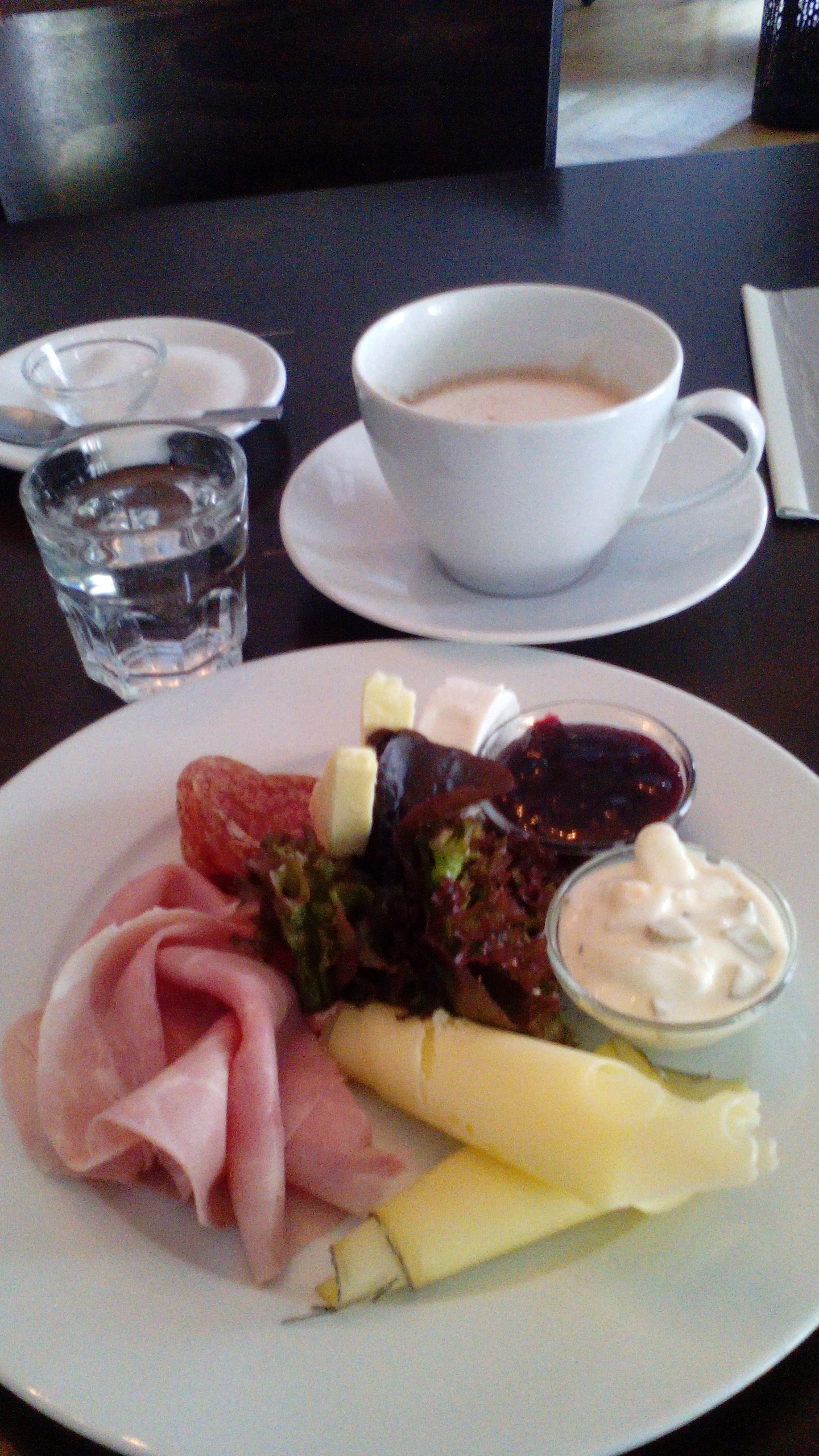 Peu après m’être installée dans mon nouveau quartier à Weißensee, j’ai découvert un endroit sympa pour le petit-déjeuner : Café Mirbach, non loin du lac. Si on oublie la musique (schlager, magnifique), c’est un joli endroit, le menu petit-déjeuner est très alléchant, diverses assiettes pré-définies, possibilité de composer son petit-déjeuner également, œufs au plat ou brouillés, crêpes,… Les œufs brouillés sont bons, les crêpes sont délicieuses, petit bémol pour le croissant qui est un « laugencroissant », genre une mauricette version croissant.