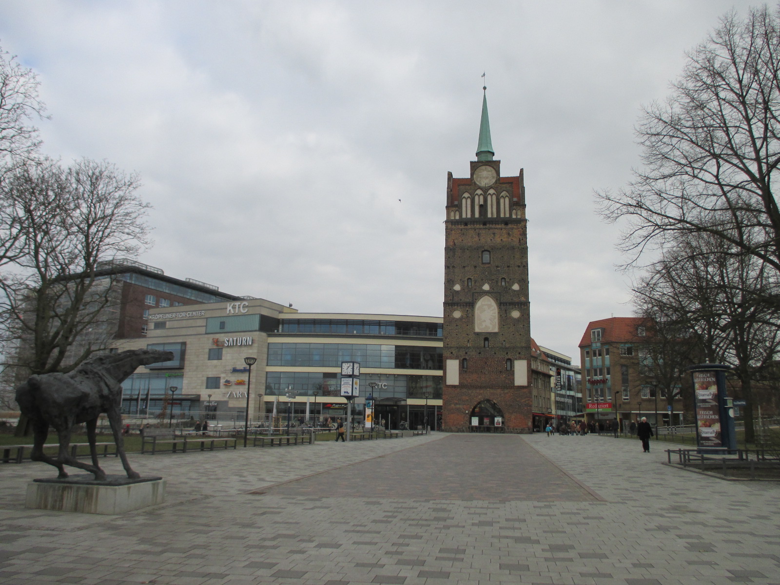 Ensuite, je suis allée un peu dans le parc qui longe les remparts à côté, ça a l’air sympa mais ce n’est pas la meilleure saison pour un parc. Donc, j’ai emprunté la Kröpeliner Straße, la rue principale du centre piétonnier, super mignon, des jolies maisons colorées… hébergeant des filiales de grandes chaînes de magasin. L’université est jolie, y’a une fontaine devant avec des sculptures animales et humaines originales. Vu que la fontaine n’était pas activée, j’ai pu m’en approcher. Suite à cela, je suis allée visiter Marienkirche, l’église Sainte-Marie, très jolie, de beaux vitraux, mais glacée. Le temps aujourd’hui était très agréable, pas mal de soleil, entre 12 et 14°C, quelques bourrasques parfois, mais au moins pas de pluie. J’ai donc continué ma balade jusqu’au Neuer Markt (nouveau marché) avec le bel hôtel de ville rose, puis Steintor (la porte de pierre), les remp
