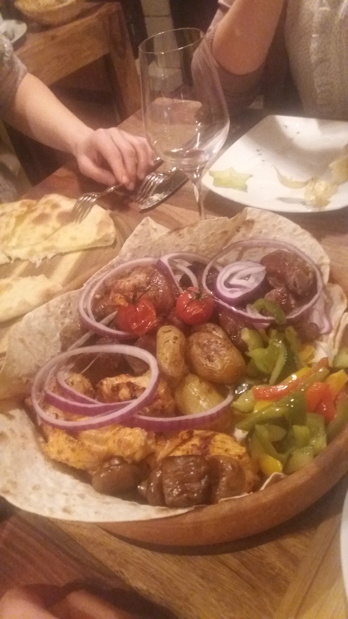 Par contre, en cuisine, c’est autre chose, là, c’est des pro. Tout était exquis. En entrée, j’ai pris un Chatschapuri, une sorte de galette aux fromages géorgiens, super bon. A priori, l’entrée avec les aubergines, la soupe et la salade au poulet étaient aussi très bons. Ensuite, on a presque tous pris la principale spécialité, le mzadi, une brochette de viande marinée avec légumes, patates, sur des pains pita sans levure. J’ai pris le poulet, excellent, bien tendre, bien juteux, un régal. Le saumon, le mélange bœuf/porc haché et l’agneau ont été appréciés.