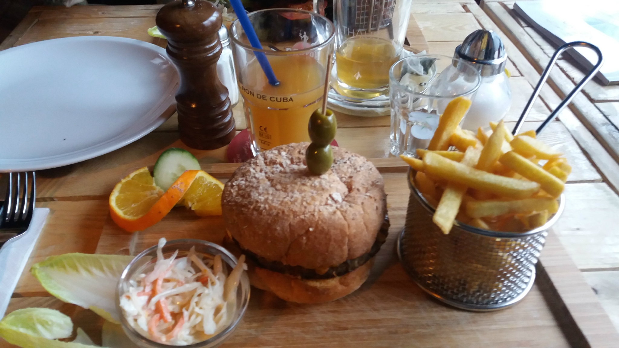 L’accueil est sympa, bon service, assez rapide. Le menu est alléchant, y compris pour le petit-déjeuner. Comme prévu, on a pris les burgers. Moi le Cheeseburger, très bon, seul bémol, trop cuit, cuit à point, je préfère saignant, il faut sûrement préciser. Ma copine le voulait bien cuit et elle l’a eu bien cuit. Sinon, la sauce est bonne, le cheddar est bien fondant, très bon, les frites sont bonnes. Z. a pris celui avec jalapenos et des frites de patates douces et elle a beaucoup aimé. Même sans coupon, les prix sont raisonnables.