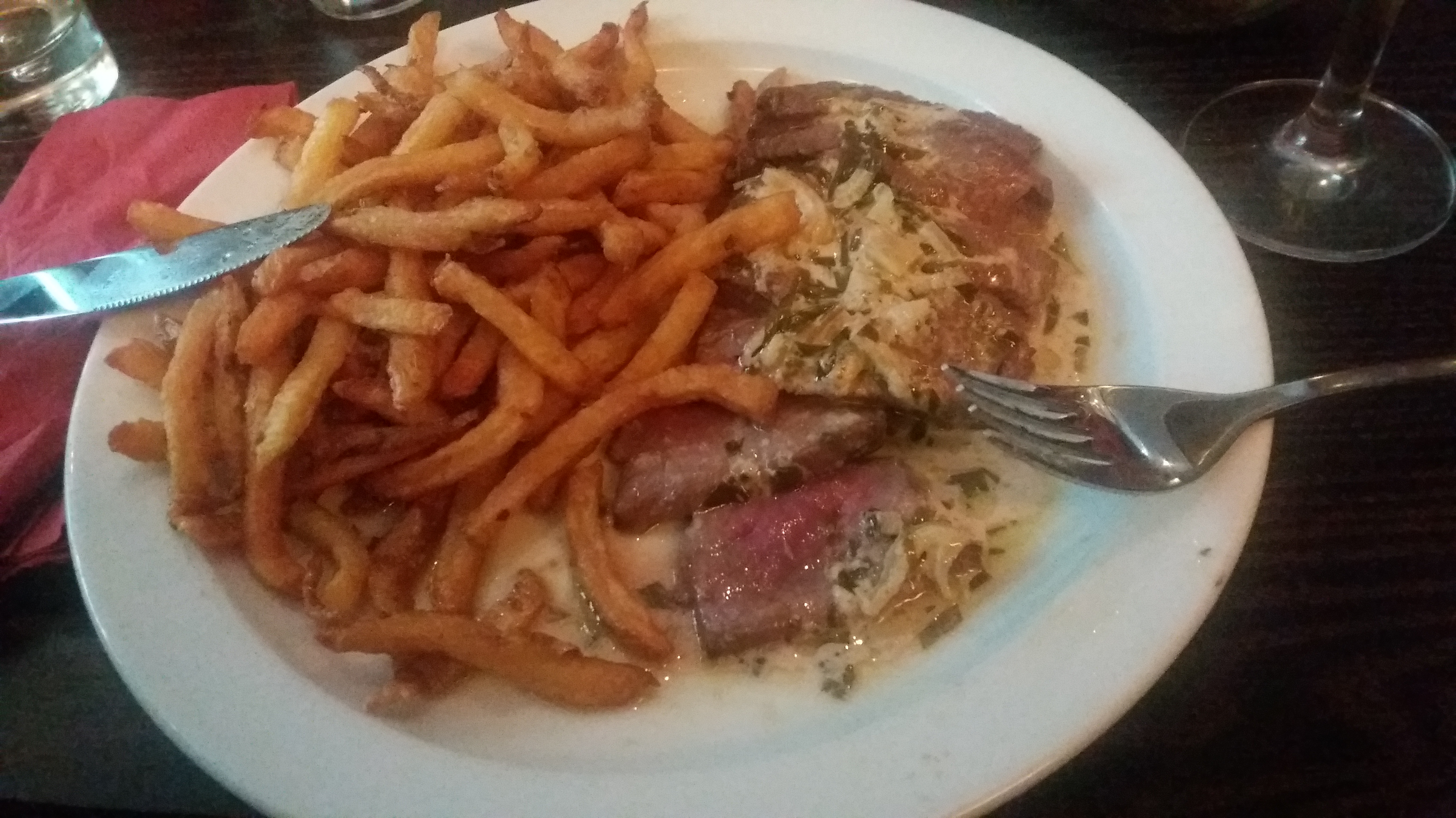 Il y a quelques temps, j’ai lu un article sur un restaurant/bar à vin français de Prenzlauer Berg que je connaissais pas encore. Cela avait l’air bien alléchant (et puis ils sont affiliés à La Bonne Franquette, bon signe) alors je suis vite allée voir ça. Joli petit local voué à l’adoration du vin avec une carte sympa, quoi que limitée pour les végétariens. Foie gras, quiches (officiellement une Lorraine mais ils mettent du fromage dedans, j’ai informé le serveur qui ne savait pas, mais en tant que quiche lorraine authentique moi-même je sais de quoi je parle), cassoulet, salade, tartare,… Et bien sûr une bonne pièce de viande de bœuf, du rumpsteak argentin servi coupé avec une sauce crème moutardée et des frites maison, un régal ! Pour le dessert, le coulant au chocolat est également à tomber. Les amateurs de vin étaient aussi ravis et les prix sont raisonnables.