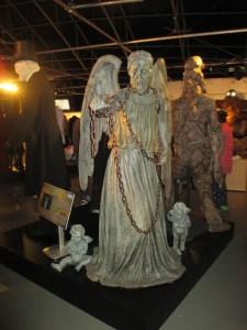 La suite de l’expo à l’étage réunit les divers monstres, Cybermens, Daleks, Anges, etc… Les tenues des Docteurs et compagnons. Des objets issus des tournages. C’était tentant de toucher, j’aurais bien appuyé sur le gros bouton rouge du