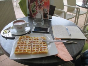 Arrivée à la gare, j’ai pris mon billet et comme j’avais trente minutes à tuer, je me suis installée à la terrasse couverte du restaurant de la gare, le soleil brillait à nouveau, j’ai dégusté une bonne petite gaufre avec