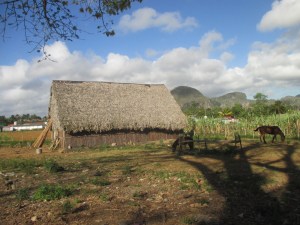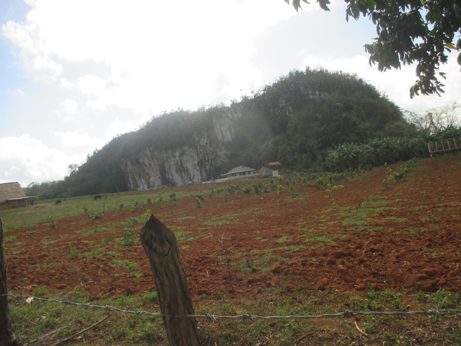 Hier matin, le réveil fut dur après une courte nuit pendant laquelle j’ai été un peu malade, sûrement quelque chose que j’ai bu ou mangé, mais tout de même d’attaque pour la randonnée au milieu des champs de tabac dans la vallée. Après plusieurs magasins pour faire des réserves d’eau (l’eau du robinet n’est pas potable à Cuba), nous rejoignons notre guide pour la matinée. On traverse quelques rues de Viñales, on croise Thomas le buffle et comme partout sur l’île des coqs, poules, poussins, chevaux, chiens, chats… Il fait chaud, le soleil cogne, mais les paysages sont superbes, les plantations de tabac, patates douces, pommes de terre, yuca, canne à sucre avec les falaises arborées en toile de fond. Le rouge de la terre et le vert des plantes, bananiers, manguiers, bambous, baobabs (bon UN baobab), c’est superbe. Mais je souffre, j’explique au guide que je supporte mal la chaleur et qu’en plus j’ai oublié de prendre un chapeau, du coup, il m’a passé sa casquette, super gentil.