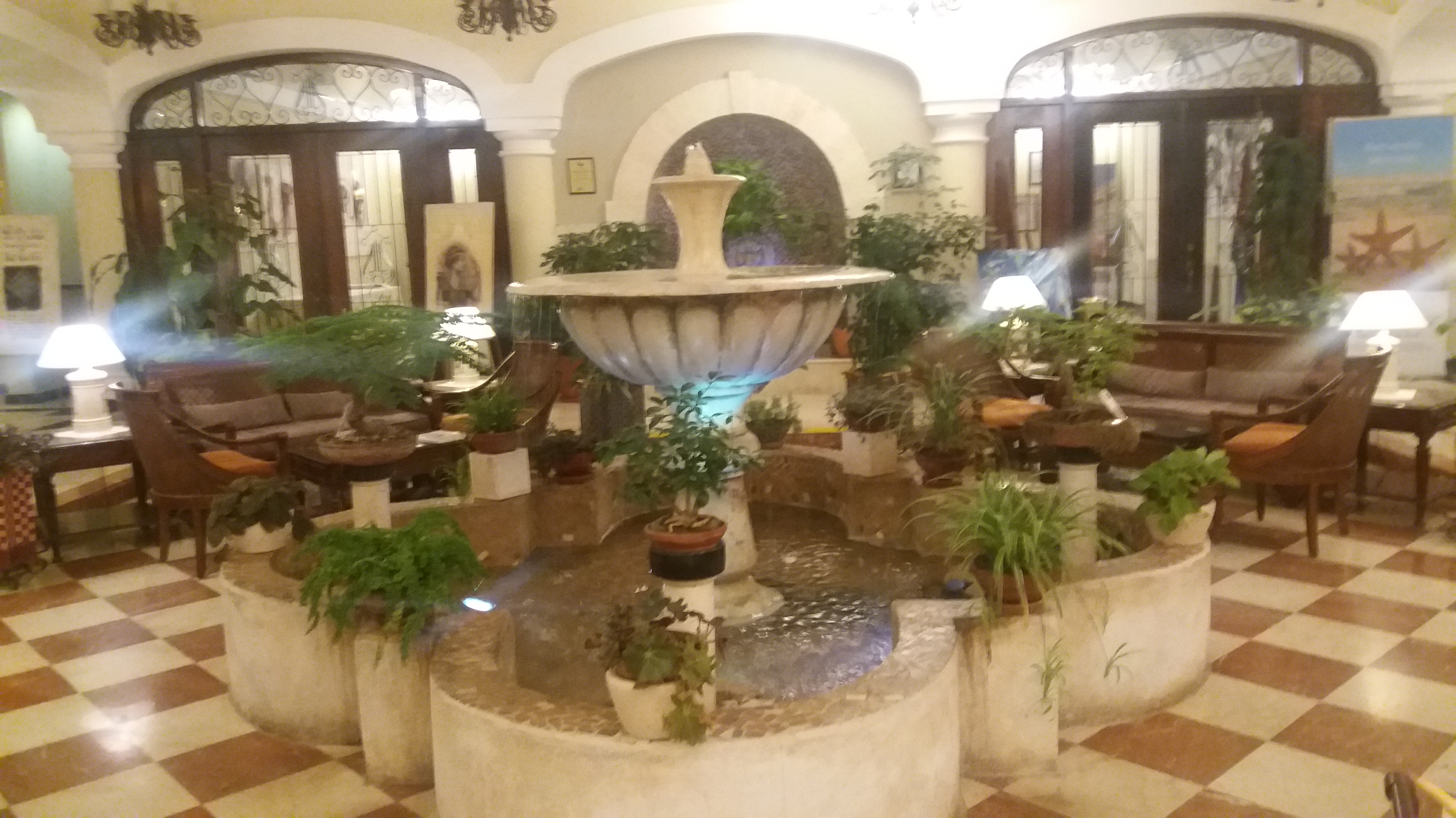 Hier, en cherchant où manger, je tombe à nouveau sur Andrew et Debbie. On discute, je leur dis que je cherche où manger, ils me disent qu’ils ont pris un verre dans le foyer de l’hôtel de luxe Iberostar sur la place Cespedes et que ce n’était pas trop cher et assez sympa. Ils proposent qu’on y aille, comme ça ils y prendront leur dessert. C’est joli, avec une lampe de verre ananas, un piano sur lequel un musicien vient jouer pendant notre repas, avec des musiciens de percussion, musique d’ambiance feutrée. J’ai pris un sandwich jambon fromage et un rhum. L’addition est correcte, excellent service. Puis je suis rentrée me coucher.