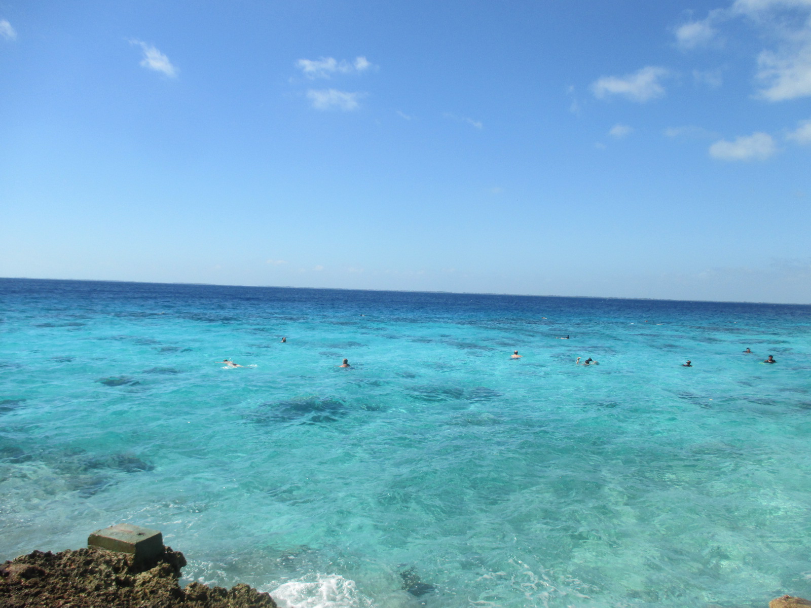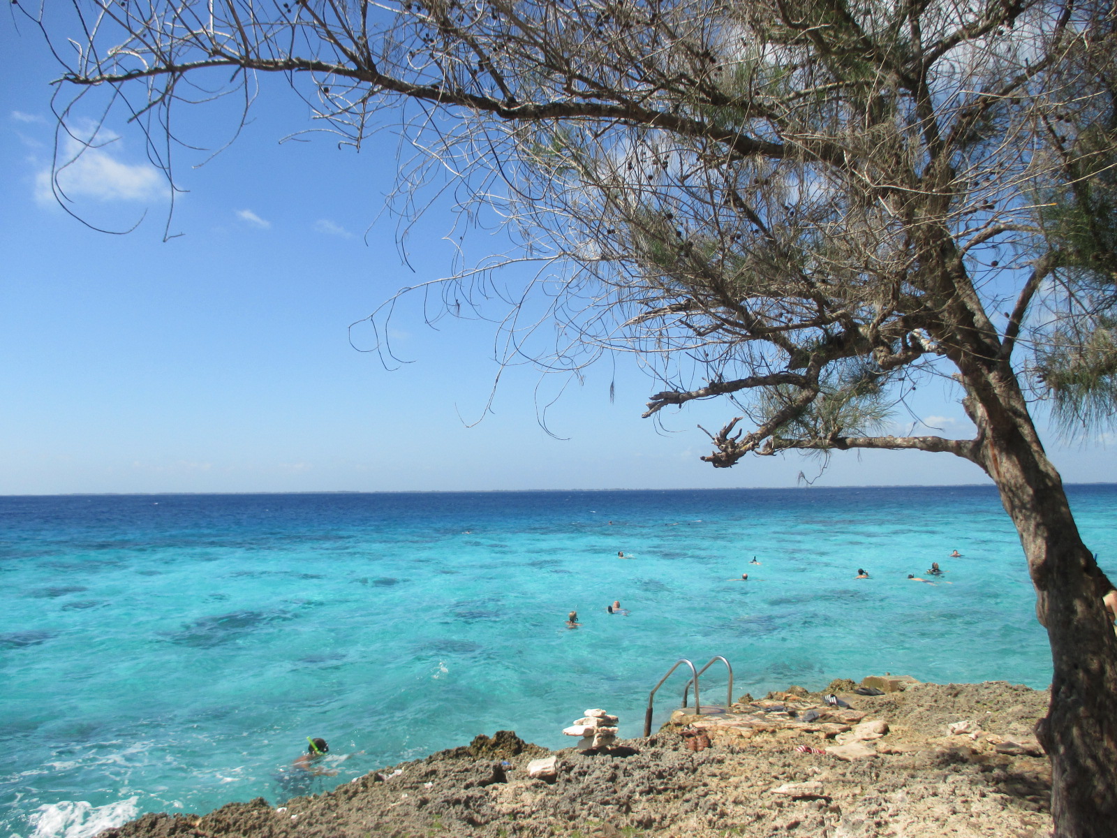 Au bout de quelques heures, nous arrivons à la baie, mais pas de cochons, juste la mer bleu turquoise, des plages de sable, magnifique. Nous nous arrêtons à Las Cuevas de los Peces à Girón, à peu près là où le débarquement de 1961 a eu lieu. C’est une plage rocheuse, la crique est rocheuse, c’est délicat pour rentrer dans la mer, une roche un peu creusée par les éléments permet de s’asseoir, les vagues sont fortes. L’eau est bien fraîche, j’ai essayé de nager un peu, mais c’est difficile avec les vagues, je n’ai pas l’habitude. Je trouve un rocher immergé sur lequel rester debout, près du bord où ressort un poteau pour m’accrocher et je reste là un moment, à admirer les couleurs exceptionnelles, le paysage paradisiaque, bercée par les vagues, enfin bercée, chahutée plutôt. Au bout d’un moment, j’essaie de ressortir en remontant sur un rocher escarpé, mais je galère, puis le papa canadien de notre groupe (j’ai oublié son prénom) vient m’aider et avec une autre touriste, ils vont récupérer mes chaussures pour me les rapporter. Je suis mille fois reconnaissante. Je vais ensuite sécher sous le parasol avant de reprendre le bus pour aller déjeuner.