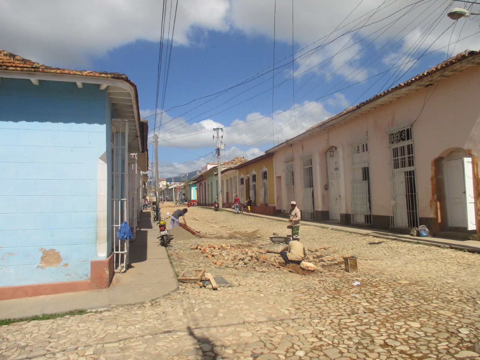 Arrivés à Trinidad, un patchwork de maisons colorées dans d’étroites rues pavées, on fait d’abord un arrêt CADECA et toilettes, puis nous visitons une poterie locale, Santander, avec potiers démontrant leurs talents. Ensuite, courte visite de la ville sous un soleil torride, j’ai mis un T-shirt un peu plus couvrant car même avec de la crème solaire 50+ mes épaules, mon dos, mes bras sont rouges, mais ça n’est pas douloureux, donc je cuis. Puis déjeuner avec le groupe sur une jolie terrasse ombragée avant d’aller dans nos maisons d’hôte.
