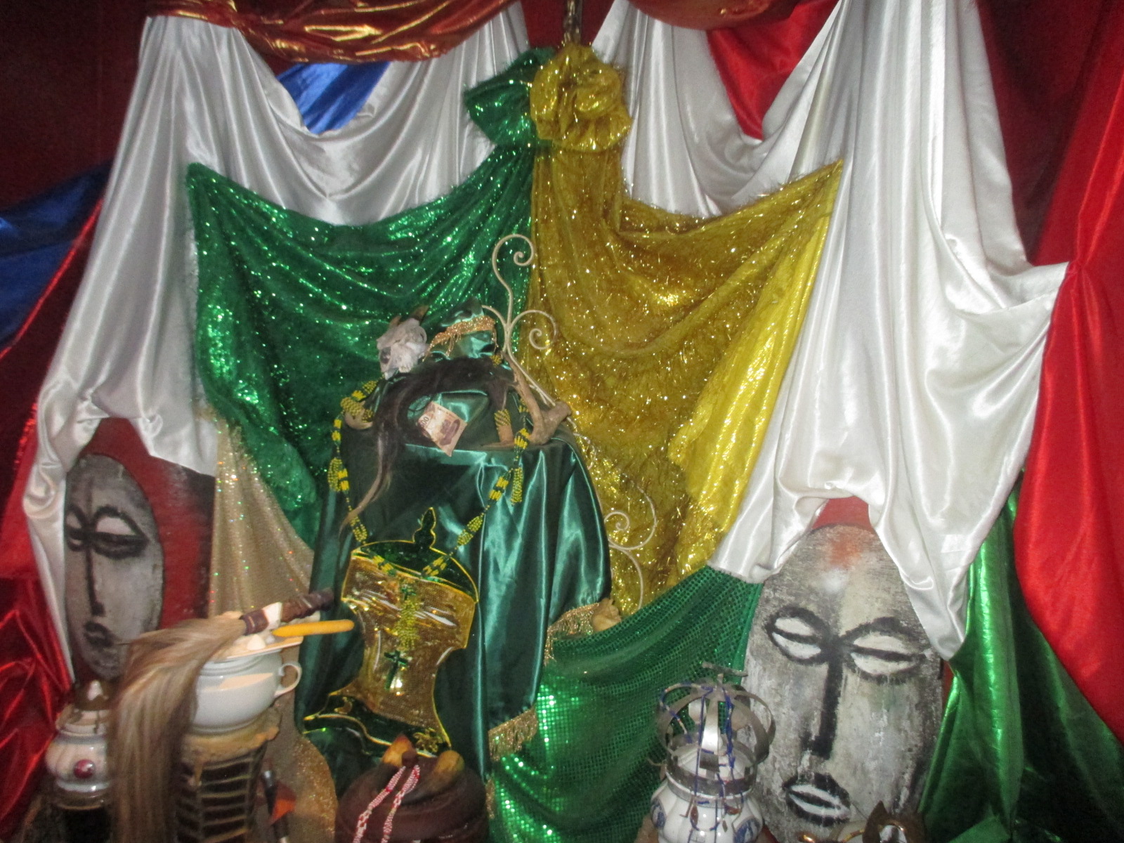 envahisseurs espagnols ont forcé la religion catholique sur les esclaves africains qui avaient amené avec eux leur religion dont les divinités sont liées à la nature. Les esclaves ont continué leur religion en cachette et ont associé des saints catholiques à certaines divinités et priaient ainsi les deux. Elle m’a expliqué et montré quelques orichas, symboles des divinités, et nous sommes allées dans la maison de Salvador voir les autels. Chaque membre de la famille a son autel dédié à la divinité à laquelle il/elle est lié(e). La femme de Salvador était là et elle m’a fait la bise pour me saluer… Ça fait bizarre. J’ai pu également visiter la galerie et j’ai eu droit à une représentation de danse, une des danseuses m’a même pris par le bras pour danser… OK… J’ai aussi vu l’endroit où ils vendent les herbes et autres articles pour les rituels, j’ai rencontré un babalawo (l’officier religieux), tout cela était très instructif. Ah oui, avant la danse on m’a offert un verre, un negrón : rhum, limonade, basilic. Bien rafraîchissant.