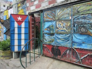 Hier matin, après le petit-déjeuner et les au revoir à quelques-uns, Osvaldo me négocie un taxi pour aller à la visite guidée sur la religion afro-cubaine ou santeria. Le taxi me dit 15 CUC, je donne donc 15 et il me rend 10, ai-je donné 25 ou est-ce que j’ai mal compris, le mystère reste entier. J’arrive donc bien en avance à Callejón de Hamel, la guide est également en avance et je suis seule, donc la visite se fera en espagnol. Elle m’explique que cette ruelle accueille une communauté pratiquant cette religion, une communauté qui mise sur l’art, avec du mobilier urbain à base de matériel recyclé. Tout cela est en partie dû à Salvador, un artiste local qui a une galerie sur place. Elle m’explique ensuite l’origine de la santeria, les