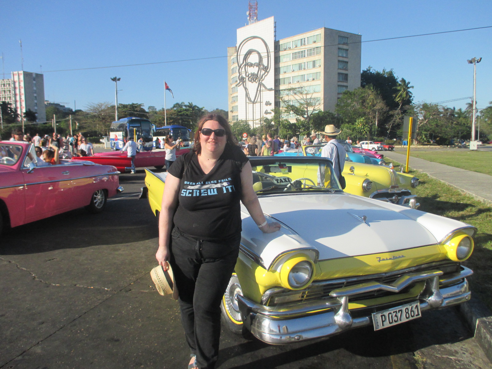 Vers 15h, je me mets en route, je dois remonter toute la rue Cuba pour mon tour en vieille américaine. Les vendeurs et taxis m’appellent tous, souvent en anglais, regarder c’est gratuit… Le problème des coins touristiques… J’arrive en avance et me pose sur un muret face au point de rendez-vous et le guide est aussi assis là. On est six en tout, une fille bizarre, un couple de New York et un couple suisse. Il y a deux voitures, on fait une voiture de francophones qui parlent espagnol et en route ! Premier arrêt : la place de la Révolution, puis la forêt de La Havane et enfin l’hôtel Nacional. Soit le guide, soit le chauffeur (le guide changeait de voiture à chaque arrêt) commente le trajet, c’est très sympa. À l’hôtel Nacional, on prend un mojito de la mafia (avec du rhum vieux en plus), bonne expérience dans l’ensemble. Je retourne ensuite au point de départ en partageant un taxi avec la fille bizarre qui au final descend en route, puis je me dirige vers Plaza Vieja pour dîner. En route, je me fais accoster par Manolo, qui m’invite à aller danser sur une place plus tard, je dis que sûrement oui, mais en fait je ne sais pas pourquoi j’ai dit ça, j’ai pas envie, je le sens pas. Et si c’est un rencard, le pauvre se sera pris un lapin. Je continue seule mon chemin et un autre comment tu t’appelles, d’où tu viens, non, stop, pour aller plus vite je dis que je suis en retard pour retrouver des amis et ciao. Je dîne donc dans un petit restaurant qui avait l’air sympa, une pizza, bof. Puis retour à la casa pour une soirée tranquille au lit avec un bouquin.