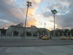 Après une sieste plus longue que prévue, je suis repartie dans les rues de La Havane, premier arrêt sur Plaza Vieja avec un cocktail XXL, sans alcool. Puis direction la poste avant de finir par hasard sur Plaza de Armas et le bord de mer. Je me suis alors posée sur un muret pour admirer le coucher de soleil qui colorait le ciel d’or et d’orange. Alors que la nuit commençait à tomber, j’ai parcouru la rue Obispo, espérant trouver un endroit sympa pour manger, avec de la musique. Premier essai : la carte parle de ropa vieja, mais ils n’ont que poisson, fruits de mer et poulet, donc non. Je me suis ensuite fait alpaguer par une demoiselle qui faisait de la pub pour un resto pas loin, ça avait l’air sympa alors j’ai tenté. La Calesa, joli restaurant, musique live d’ambiance, j’ai commencé avec un daiquiri, puis en entrée des bananes vertes frites fourrées au jambon. L’extérieur frit, la garniture et le fromage fondu dessus, super, mais la texture de l’intérieur de la banane, bof, en même temps je suis bizarre niveau goût. Puis un filet de bœuf uruguayen, enfin, je pensais que la vache venait d’Uruguay, mais c’est la préparation : pané et fourré jambon-fromage, un peu trop cuit mais pas mauvais. Ensuite, je suis retournée sur la rue Obispo, un bar m’a attirée avec de la salsa live et des gens qui dansaient. Je me suis posée au bar, j’ai pris un Havana 7 ans, puis la musique s’est arrêtée et il ne se passait plus rien, donc j’ai repris ma route, je suis allée voir sur Plaza Vieja, rien, alors retour à la casa.