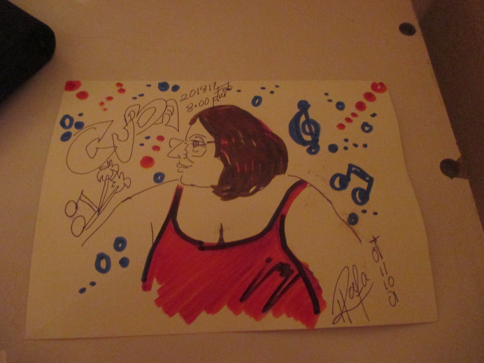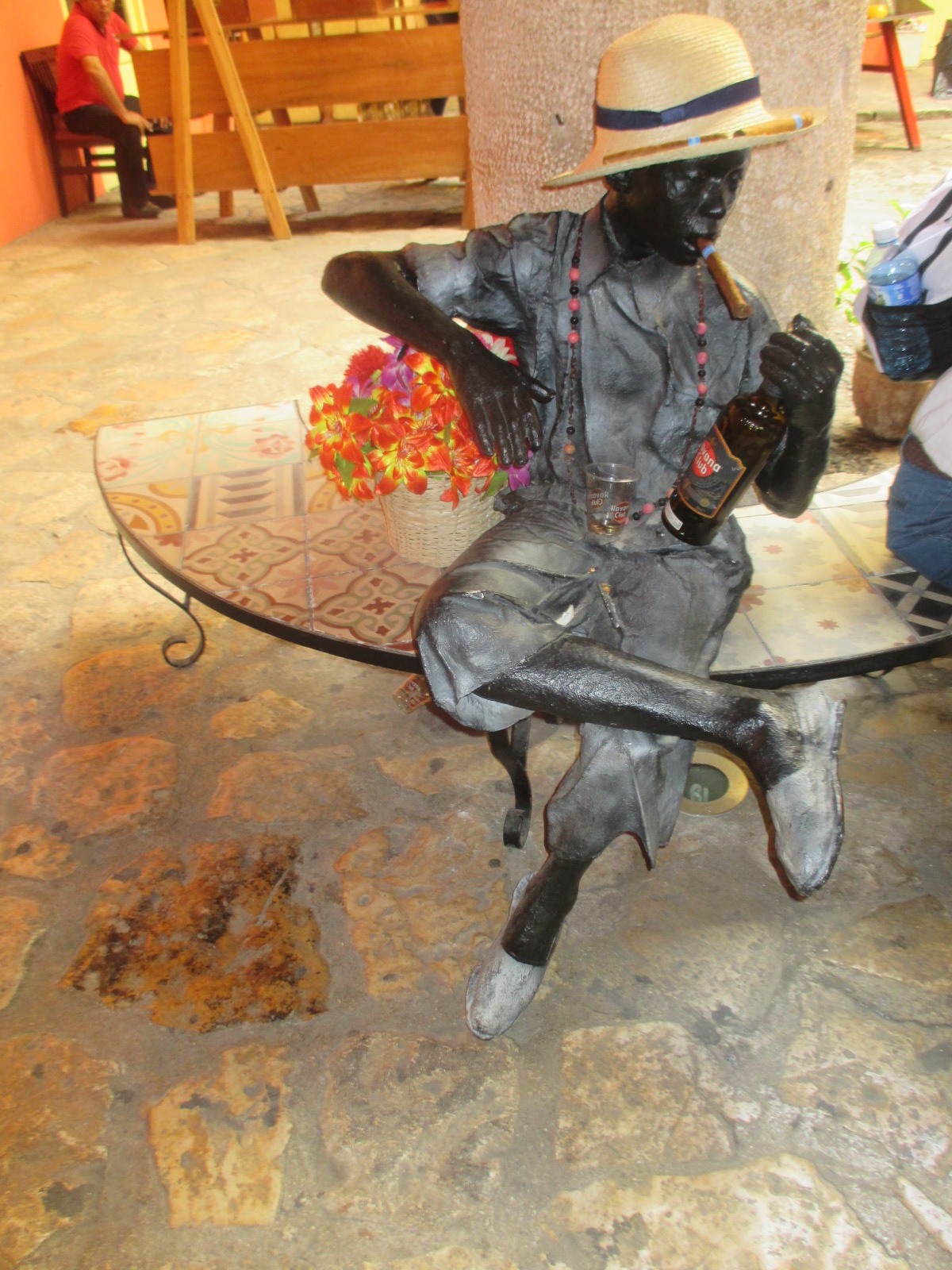 Ensuite, je reprends la rue Obispo jusque Plaza de Armas, un groupe joue de la salsa et les gens dansent, super ambiance. Une fois la musique finie, je me pose sur un banc avant de retourner sur Plaza Vieja où j’avais repéré un resto à l’air sympa hier. La Vitrola, genre diner US. Un peu d’attente, mais je peux avoir une table juste pour moi. Cool. Là aussi, de la musique. En apéro, un rhum, j’avais commandé en entrée des boulettes de fromage mais elles ont été oubliées, puis en plat un burger pas mauvais du tout avec chips de banane et pour finir un brownie. Miam. Pendant l’attente et le repas, je remarque un homme assis sur les marches en face, vêtu de blanc avec seulement un collier de couleur, a priori il est en année d’initiation pour la santeria, il écrit et donne des papiers aux gens à table. Et quand il donne son papier au couple de la table d’à côté, en fait c’est un portrait. Il m’a fait aussi, résultat bof, mais c’est sympa. Donc en partant, je vais le voir et lui donne quelques pièces. Et il me fait la bise et me dit « merci mon amour ». OK… Si tu veux…