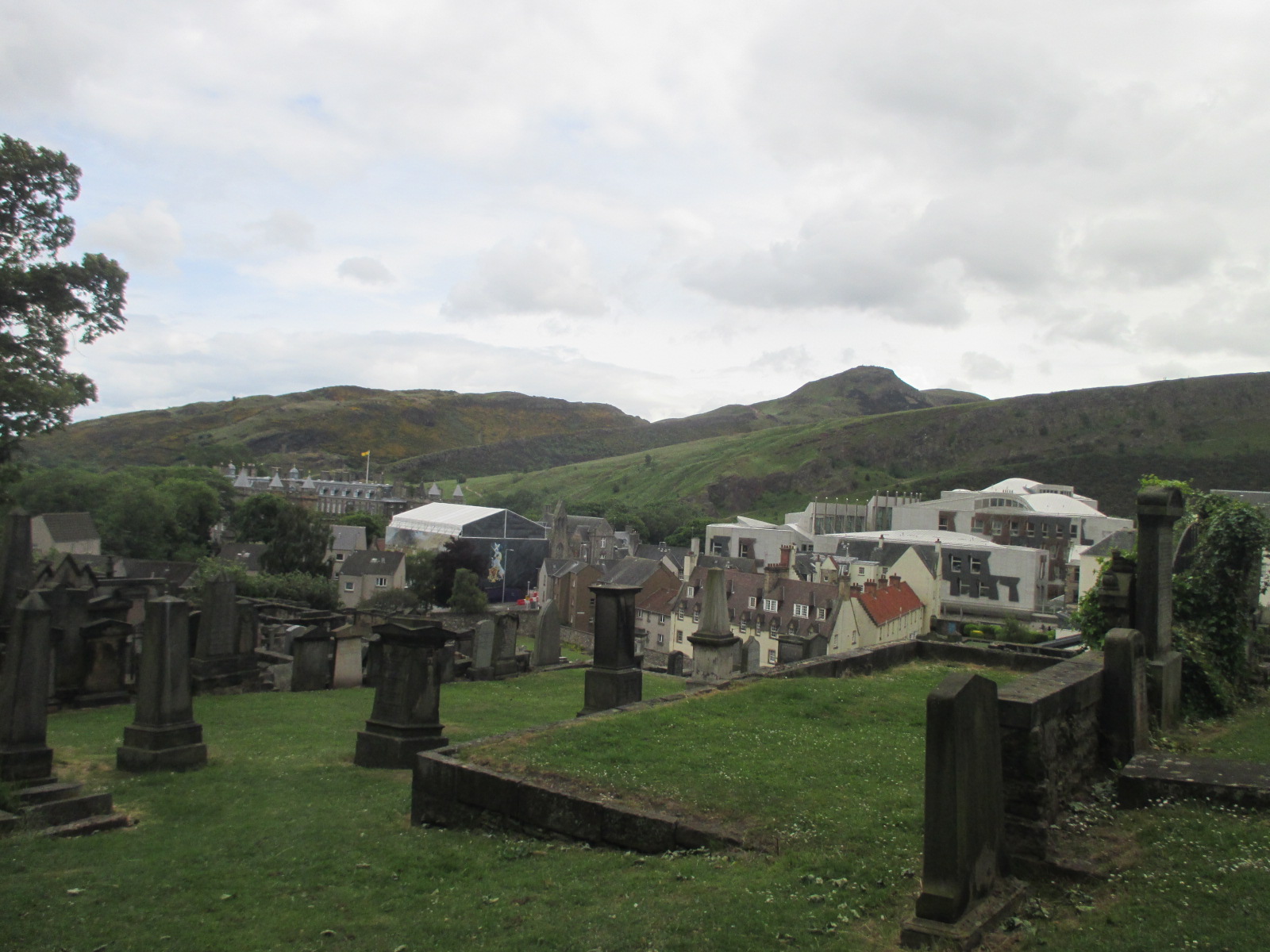 Enfin bref, après une matinée de travail, je me suis mise en route vers Prince Street pour la partie qui monte, le long d’un parc sur une colline que je note à explorer plus tard. Je suis allée jusqu’au cimetière de Calton, « tombes avec vue » qu’ils l’appellent, certes on a une belle vue sur Arthur Seat et le quartier du Parlement. Je l’ai donc traversé, c’est très vert, et arrivée en bas, je ne me sentais pas bien (ça faisait longtemps), je me suis assise près du Parlement avant de remonter la Royal Mile, tiraillée entre l’envie d’explorer et de