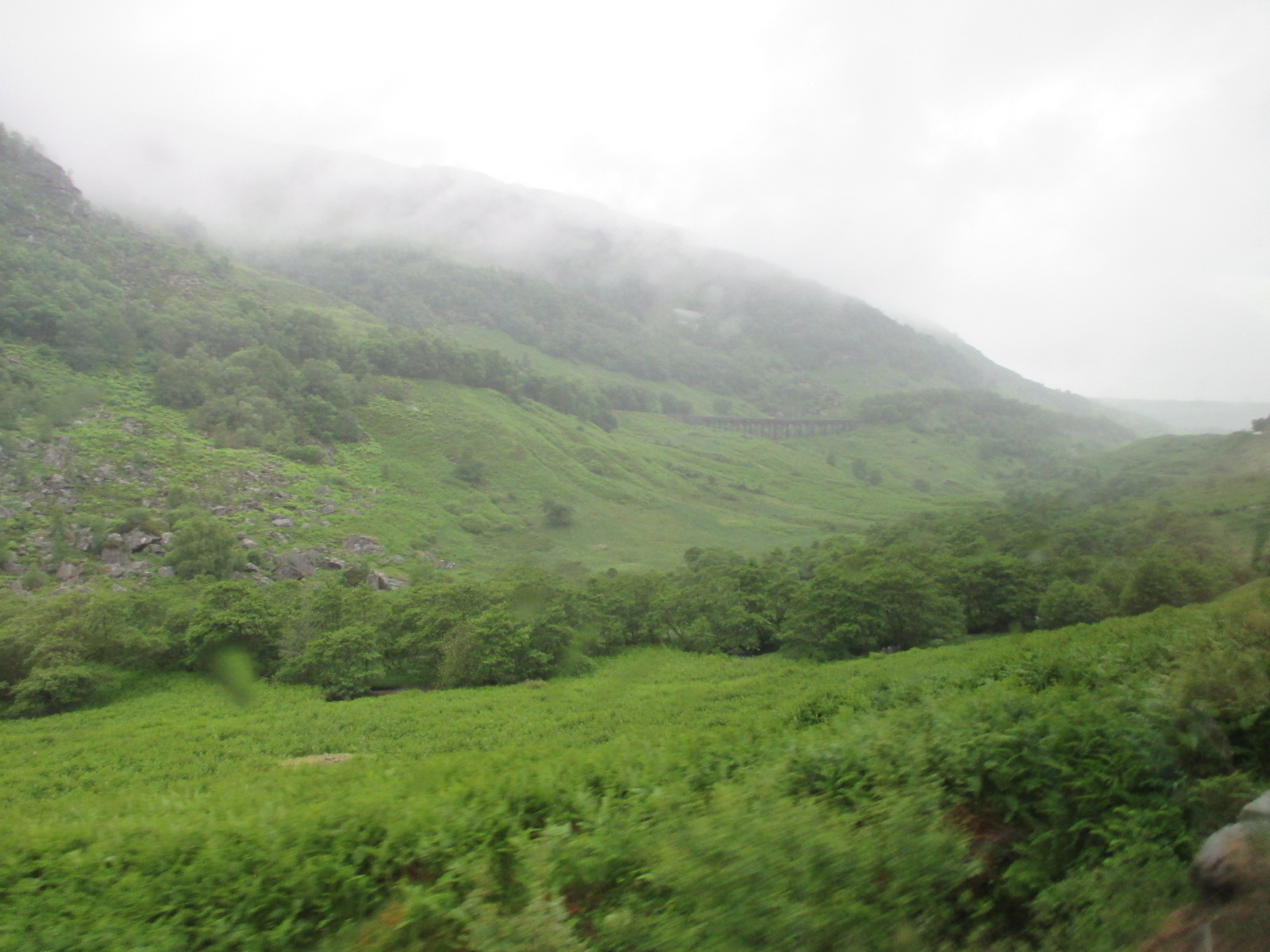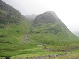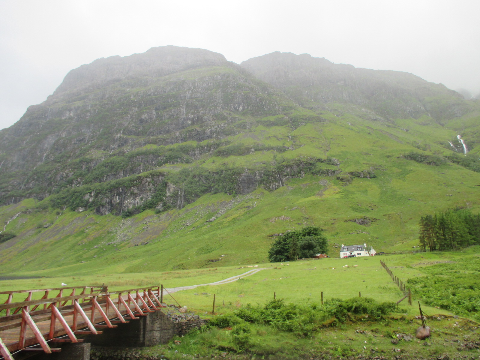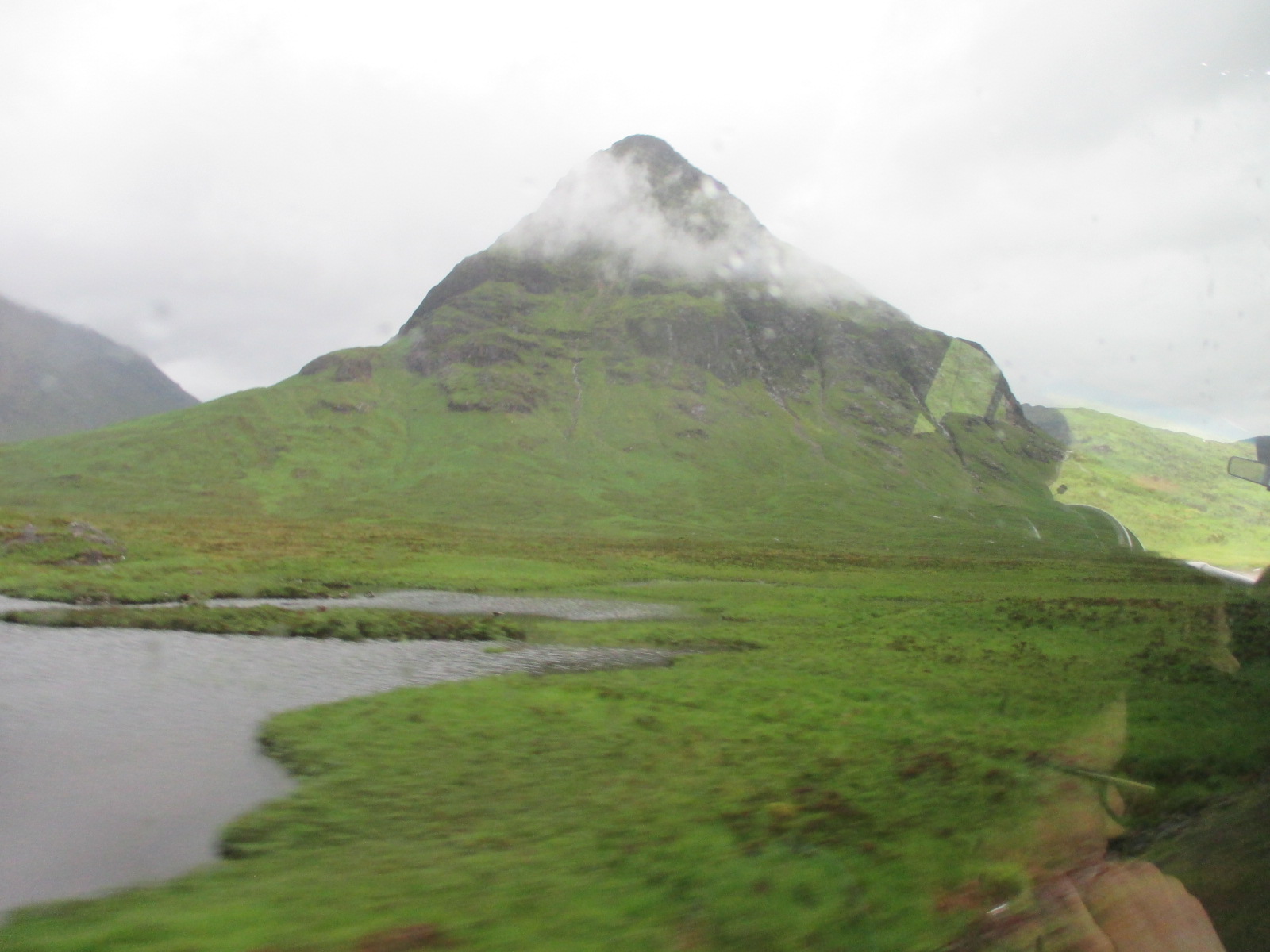Nous avons roulé sous la pluie principalement, entourés de verts sommets, un paysage dramatique avec les nuages bas et le brouillard, sur de la musique celte douce, c’est magique, on s’attendrait presque à voir débouler des elfes, licornes et autres fées. Ah oui, et avant Callender, nous sommes passés à côté du château de Stirling et du monument à William Wallace, entre les deux ont eu lieu les affrontements entre anglais et écossais, le tout sur la musique de Braveheart évidemment.