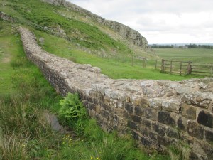 Donc oui, nous voici sur les routes d’Angleterre, entre des champs de moutons et de vaches, puis le voilà, le petit mur, nous sommes sur la partie Est du Mur qui était bien plus haut à l’époque. On passe le Sycomore Gap, deux collines que parcourt le Mur et entre les deux, un arbre isolé, superbe. Puis arrive notre premier arrêt à Steel Rig, un pan du Mur d’Hadrien préservé qui monte sur une haute colline. Comme on a que 45 minutes, je ne tente pas l’ascension, car me connaissant, c’est le temps qu’il me faudrait pour grimper. Je longe
