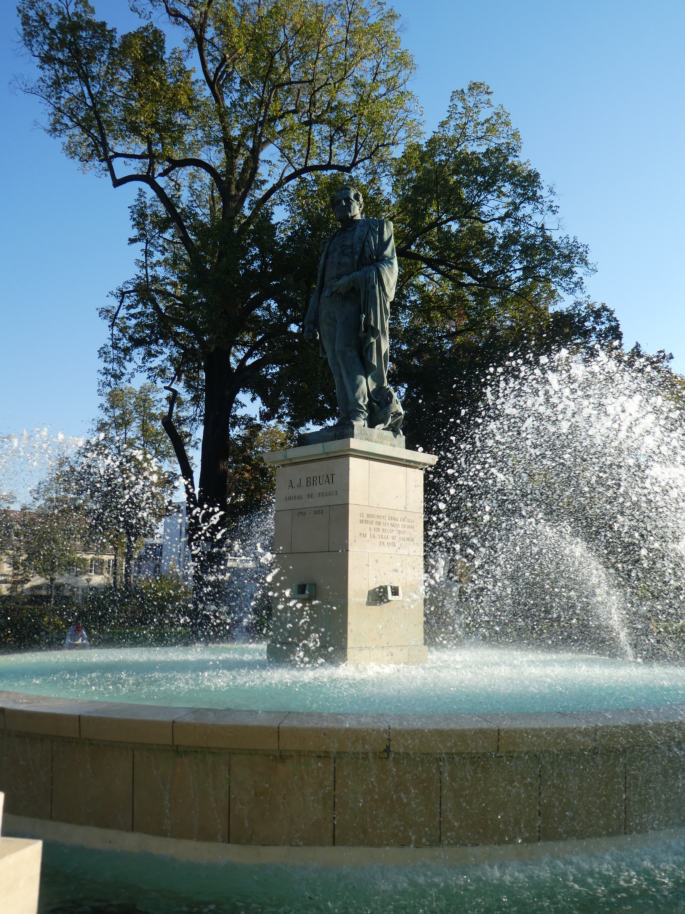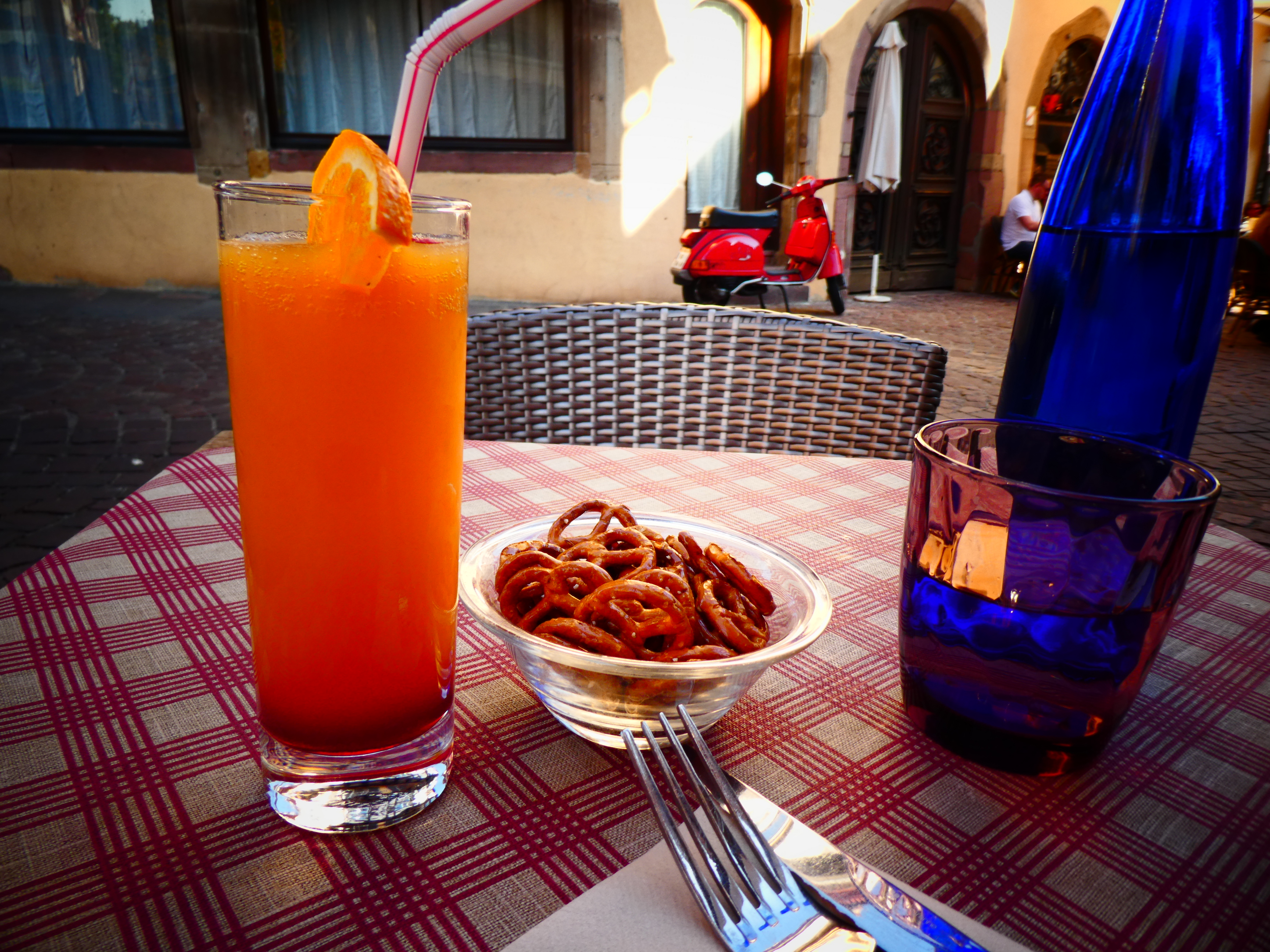 Puis je prends la direction de la gare, en train il faut moins de quinze minutes pour rejoindre Colmar. Comme j’arrive à midi, je décide d’aller dans un restaurant que mon guide recommande, mais il est fermé, alors que d’après les horaires d’ouverture et Google il devrait être ouvert. Du coup, je prends place à la terrasse du Fer Rouge. Un cocktail sans alcool (Cendrillon), du foie gras, une demi tarte flambée au munster, c’est pas mauvais.