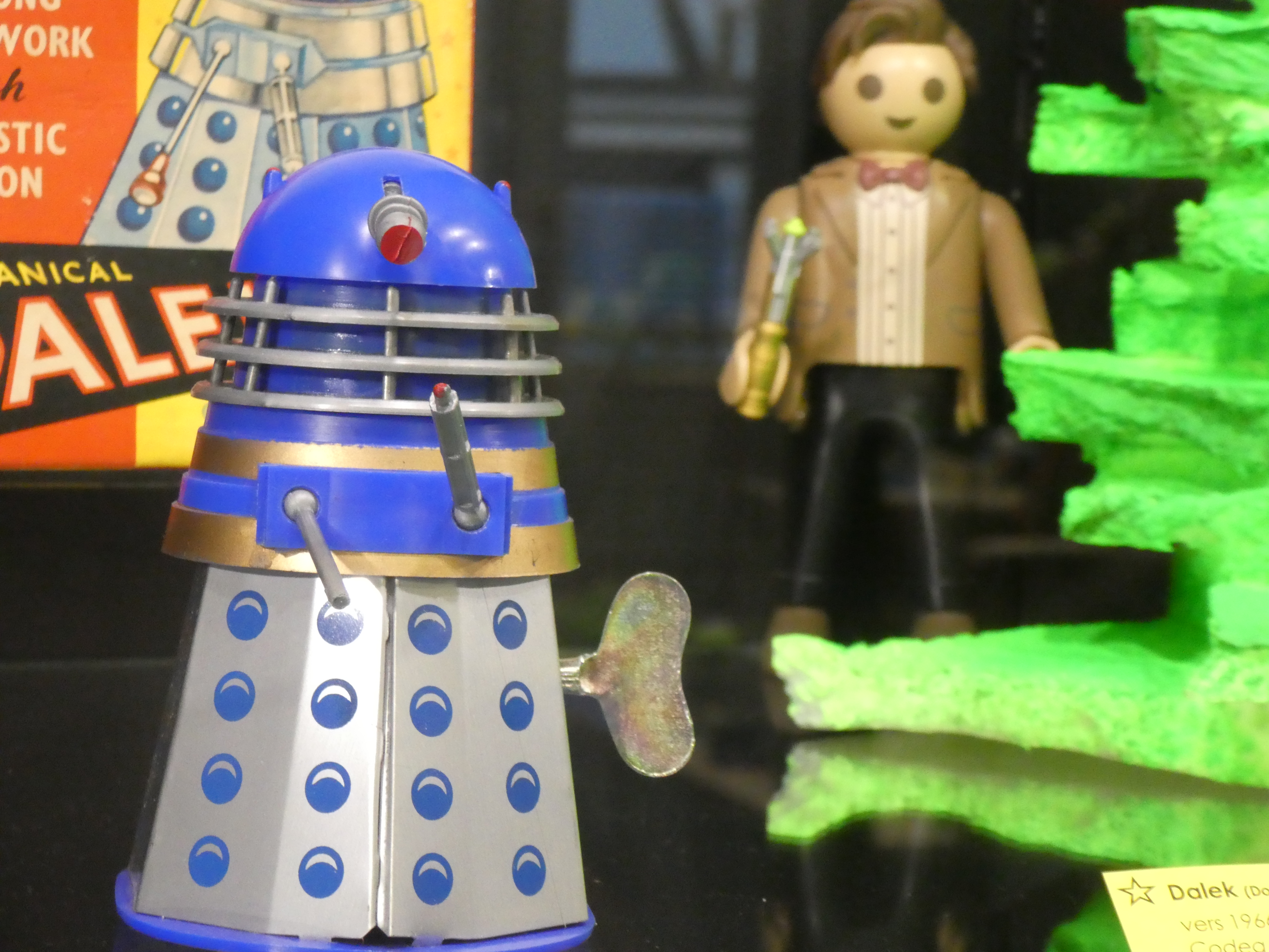 Popples, Bisounours, Goldorak, Barbies, voiturettes,… Ils viennent aussi de démarrer une exposition temporaire sur les jeux de l’espace. Y’a une vieille machine d’arcade avec les Space Invaders (là aussi, je perds). Moi, j’adore ! Des personnages Star Wars. Sur une affiche de l’expo, que vois-je ? Un Dalek !!! Et dans une vitrine : Bender, R2D2, Alf, ET,… et des Daleks de l’époque des classiques, mais aussi le 4e et le 11e Docteur en Playmobil. Le dernier étage est réservé aux maquettes et trains miniatures. Franchement, j’adore, vraiment super.