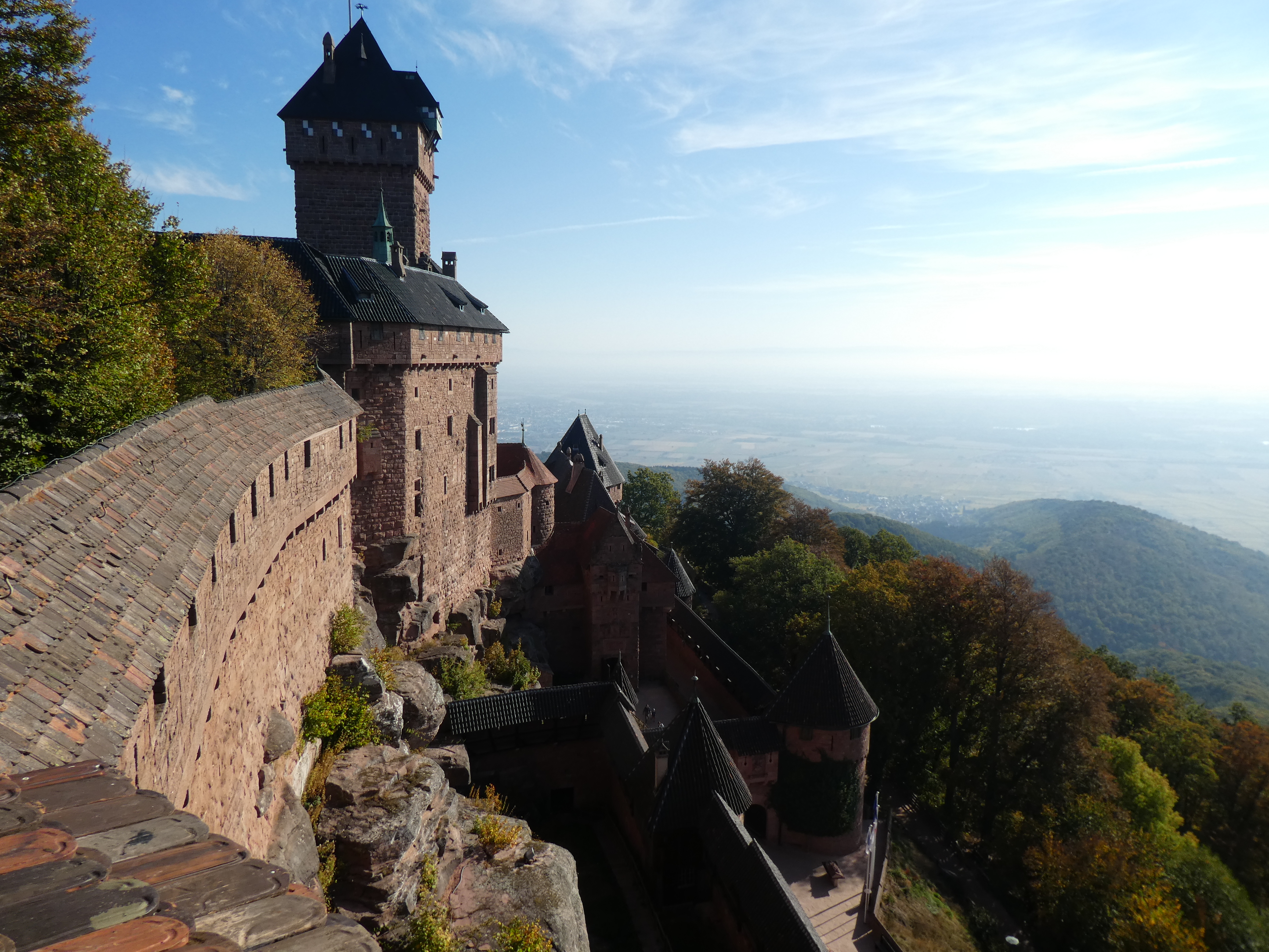 Ensuite, direction le château du Haut-Koenigsbourg, la route avec les vignes, les champs, les ballons des Vosges en toile de fond et un grand soleil, c’était vraiment bucolique. Pour le château, comme je ne suis pas trop en forme en ce moment et que je marche du coup lentement, nous n’avons pas pris l’option parking en bas et grimpette dans les bois et nous nous sommes garées juste à l’entrée.