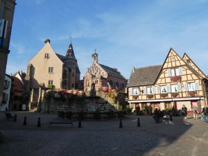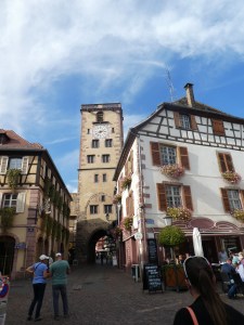 Hier soir, un car de retraités allemands est arrivé à l’hôtel et ce matin un Monsieur a repéré mon T-shirt des Eisbären Berlin et m’a demandé si je jouais au hockey, non, juste fan. Et on a papoté un peu. Ensuite, C. et M. sont venues me chercher. Premier arrêt : Eguisheim, a priori élu plus beau village de France, en effet très joli et bucolique avec un tour de ronde sur les anciens remparts. Puis nous avons pris la route de Kaysersberg, aussi très joli avec le château, nous n’y sommes pas montées par manque de temps.