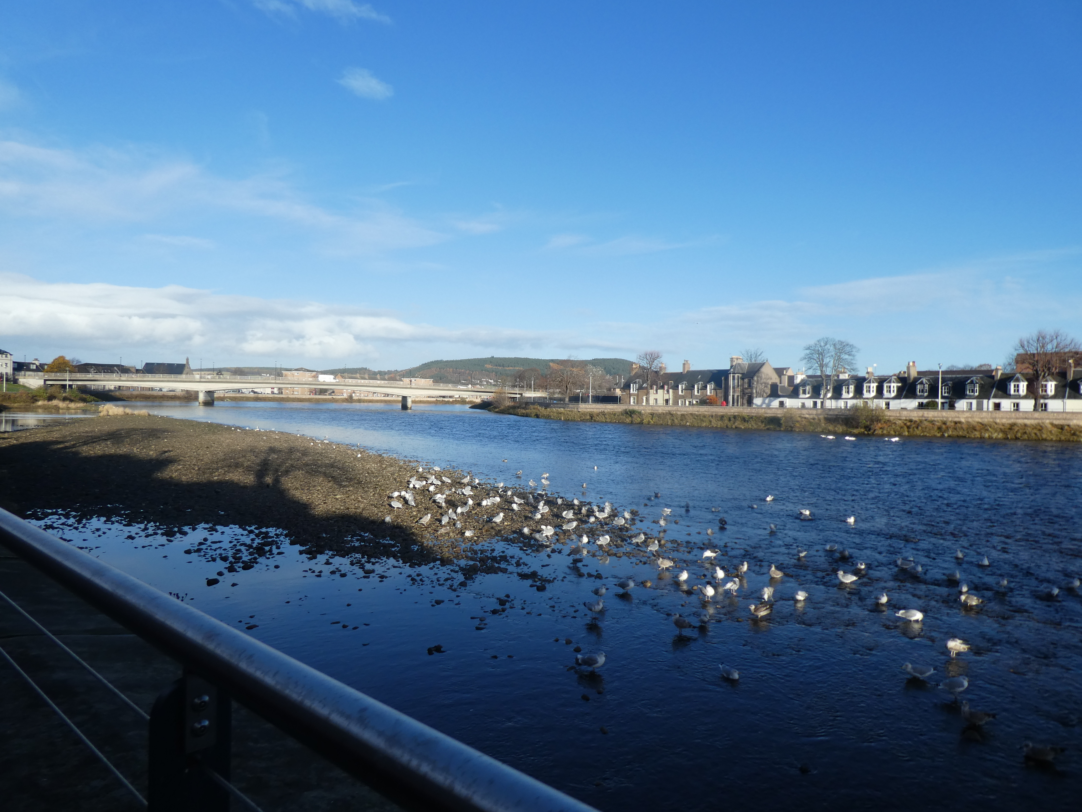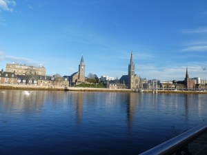 Enfin, mon vol pour Inverness, j’ai dormi un peu dans l’avion. En arrivant, les paysages par le hublot entre mer et montagne, magnifique. Arrivée sous le soleil, passage de la frontière avec des douaniers super sympa et du coup ma valise m’attend déjà. Direction le bus, par chance celui d’avant a du retard, ça évite d’attendre une demi-heure à une heure. Une fois arrivée à Inverness, je demande à Google Maps de m’indiquer le chemin de la gare routière à mon Bed&Breakfast, dix minutes plus tard, après avoir passé un joli pont piéton qui bouge un peu sur la rivière Ness, Leah m’accueille chaleureusement et me donne des bons conseils de restaurants, pubs et endroits pour de la musique live. Elle prend aussi ma commande pour le petit-déjeuner demain, je vais tenter le tout écossais avec du haggis…