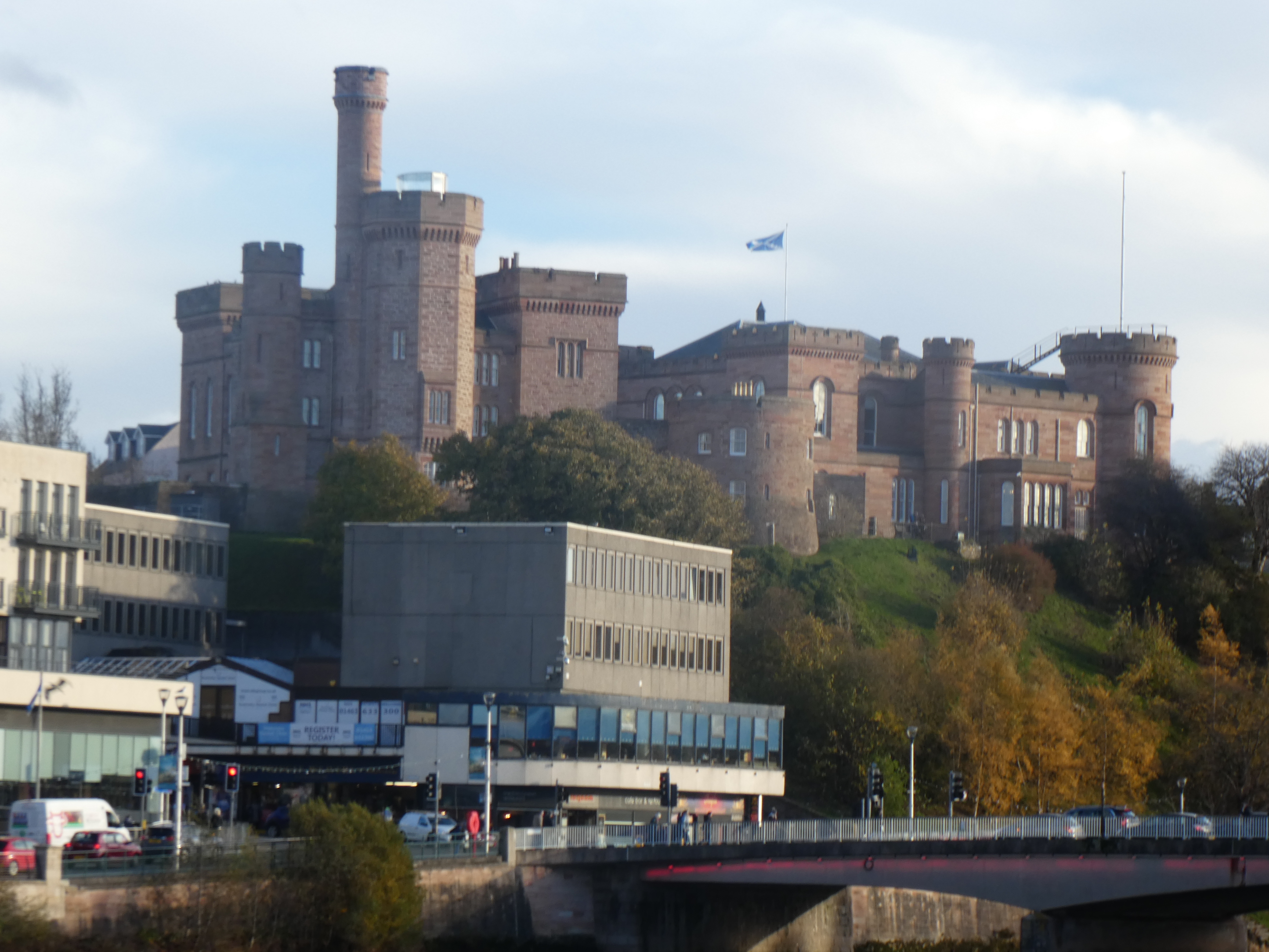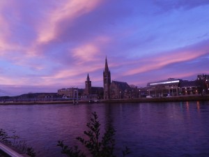 Sur ce, histoire d’en profiter tant qu’il fait encore jour, je me mets en route. Je retraverse la rivière et suis le conseil de Leah pour déjeuner, direction le Black Isle Bar, ils servent principalement pizzas et salades, tout (ou presque) bio et produit localement. Accueil très sympa, je prends une pizza au salami de cerf, un délice, avec un jus de pomme bio. Pour les amateurs de bière, ça a aussi l’air bien intéressant. J’ai vu qu’ils font aussi des plateaux de fromage écossais, je verrai pour peut-être y retourner samedi ou lundi. Ensuite, petite balade autour du château, l’intérieur n’est pas accessible au public, à part une petite tour qui était fermée. On a tout de même une belle vue sur la ville et la Ness de là. J’ai ensuite voulu redescendre au bord de l’eau via un petit chemin de terre, mais au bout je me suis retrouvé coincée… et je ne suis pas assez flexible pour grimper par-dessus une barrière. Je suis donc remontée pour redescendre par le trottoir et retourner me poser au B&B alors que le soleil commençait à se coucher, déroulant des rubans or et roses.