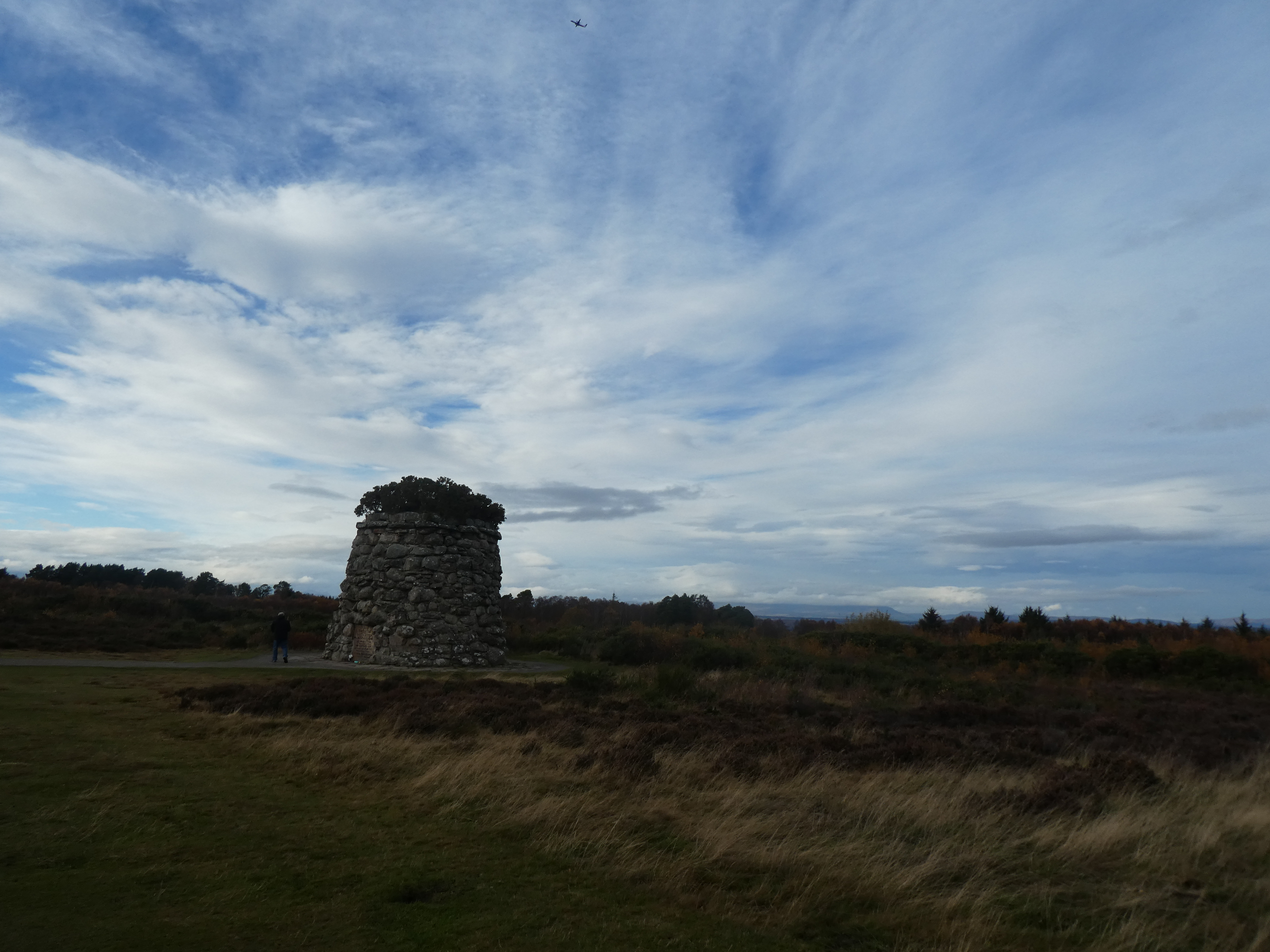 Ce matin, je me suis mise en route vers 10h. Tout d’abord le centre commercial Eastgate pour prendre le bus vers le champ de bataille de Culloden. Le n°5 vers Croy s’arrête devant la statue de la licorne. Une fois installée, je remarque que les arrêts ne sont pas annoncés, mais bon j’ai demandé au chauffeur un billet pour Culloden Battlefield (je ne connais pas les zones) et c’est sûrement bien visible quand on l’approche. À un arrêt dans la zone d’Inverness, j’entends une autre touriste demander à une passagère si c’est là le champ de bataille, et la passagère de lui dire qu’elle demandera au chauffeur de la prévenir. À peu près à l’heure d’arrivée prévue, on arrive, et en effet, on peut pas le louper.