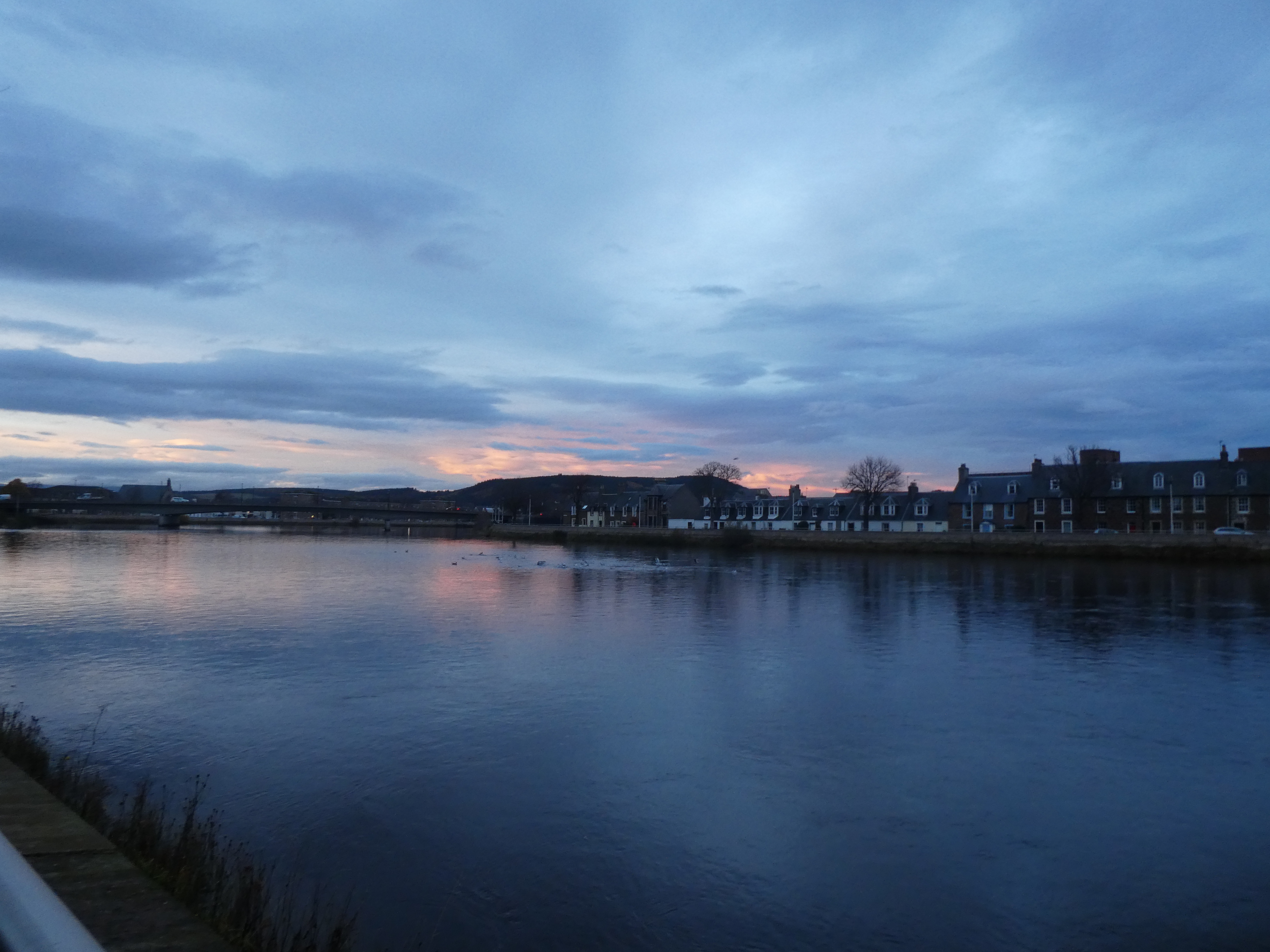 Suite à cela, je me suis baladée le long de la rivière Ness, à un moment le chemin s’éloignait de la rive, donc j’ai fait demi-tour et j’ai vu ensuite un panneau pour l’ancienne jetée des ferrys à 1,5 km et le canal Calédonien à 2 km, oui en kilomètres et pas en miles, de toute évidence bien destiné aux touristes. J’ai longuement hésité, mais comme la nuit tombait moins d’une heure plus tard, j’ai passé, pas envie de me retrouver au milieu de nulle part en pleine obscurité… et au bord de l’eau en plus.