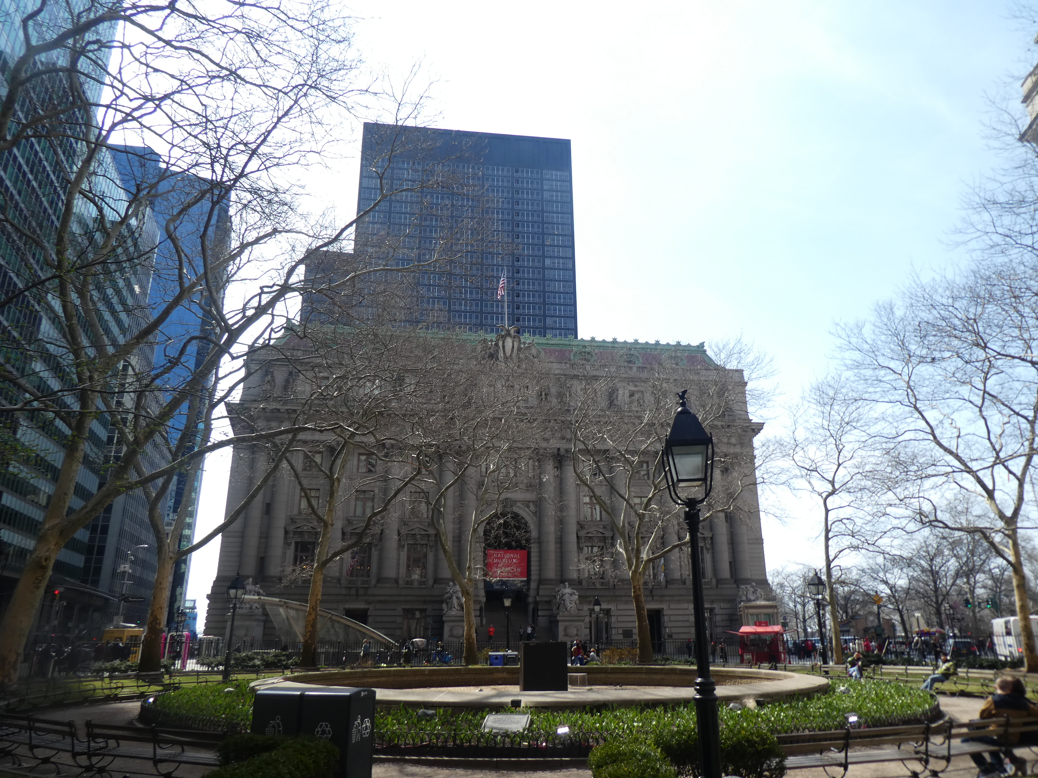 Hier matin, réveil assez tôt après une bonne nuit de sommeil. Le petit-déjeuner de l’hôtel est assez simple, mais bon. Nous avons donc attaqué la journée de bonne heure pour visiter plutôt le sud de Manhattan, suivant un itinéraire suggéré par mon guide Lonely Planet reprenant certains points que je voulais voir. On a commencé dans le quartier de Tribeca pour le café La Colombe du 19e siècle, joli bâtiment. On a fait un arrêt au QG des Ghostbusters, puis notre balade nous a menées vers la cour de justice, des quartiers alliant immeubles anciens et gratte-ciel modernes, assez sympa. Les bâtiments new-yorkais typiques avec les escaliers de secours à l’extérieur, c’est vraiment chouette. On a fait un arrêt rapide au Woolworth Building, un immeuble gothique, le hall d’entrée est impressionnant, il est même possible de réserver des visites. Nous avons voulu visiter la chapelle St Paul, mais elle était fermée pour événement privé, alors nous sommes allées au mémorial du 9/11, c’était vraiment émouvant, j’en avais la gorge serrée. On n’a pas fait le musée en raison de la file d’attente interminable, mais les bassins avec les noms, ça fait quelque chose. Ensuite, direction Wall Street, la jolie église Trinity Church dont on ne peut visiter que la chapelle et le cimetière
