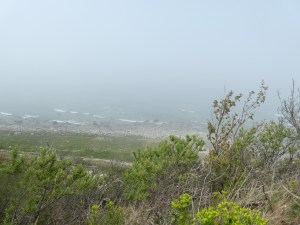 Nous avons ensuite pris la route de Cap Arkona, à l’autre bout de l’île, tout au nord. À l’extérieur du village de Putgarden, il y a le « dernier parking pour Arkona et Vitt », nous nous sommes donc garés là et avons d’abord déjeuné au snack spécialisé dans le poisson, avec quelques options non marines pour mon plus grand plaisir et celui de ma maman. La cap est à deux kilomètres, il y a un petit train qui y mène (un autre mène à Vitt à une distance similaire), nous avons pris cette option, car c’était aussi plus facile sans connaître le chemin. Nous avons traversé le village jusqu’aux trois phares du cap, de là il est possible de rejoindre Vitt, un ancien village de pêcheurs avec des ruines, par un chemin de randonnée de 1, 3 km. La lumière y était étrange, car le soleil se mêlait au brouillard, du coup on ne voyait pas la mer (mais on l’entendait). Nous n’avons pas pris le chemin vers Vitt, mais vers Gellort, le point le plus au nord de l’île. Le chemin passe près de champs et dans une magnifique forêt verdoyante, il débouche donc sur le point de vue de Gellort, avec le brouillard, on ne voyait pas grand-chose, mais c’était quand même sympa. Il y a un long escalier descendant vers la plage,