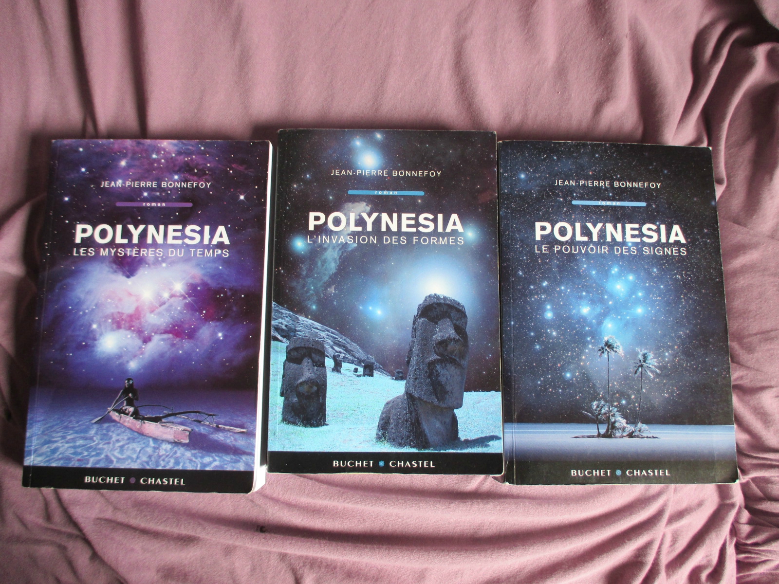 En récupérant des livres dans le grenier de mes parents, je suis retombée sur un livre que j’ai dû acheter peu de temps avant de partir pour Berlin, et je me suis rendu compte qu’il s’agissait en fait du tome 2 d’une trilogie, j’ai donc acheté le 1 et le 3 et je me suis plongée dans l’univers de Polynesia, signé Jean-Pierre Bonnefoy. Dans l’ordre : Les Mystères du Temps, L’Invasion des Formes et Le Pouvoir des Signes.
