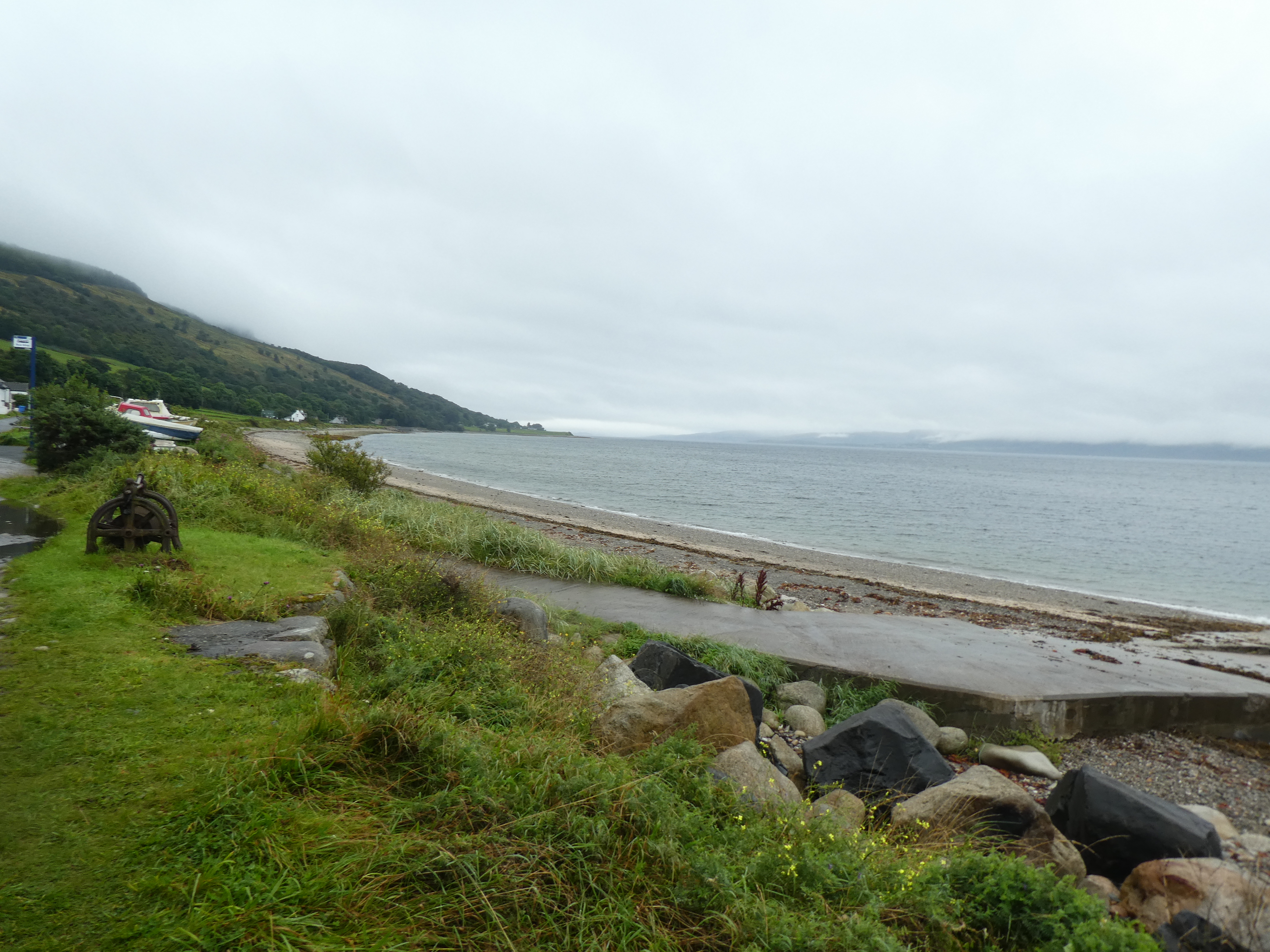 La distillerie est dans un cadre sympa, pendant que certains faisaient la visite guidée avec dégustation de whisky, Pete a emmené trois d’entre nous se promener dans les alentours. Nous sommes allés jusqu’à la pointe nord de l’île, en passant devant le château en ruines et jusqu’aux 12 Apôtres de Lochranza, un groupe de douze maisons qui avaient jadis des fenêtres de formes différentes que les épouses éclairaient pour passer un message à leurs maris pêcheurs.