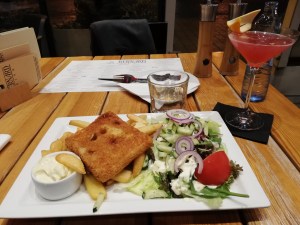 Mon serveur était excellent, vraiment sympa (et charmant j’avoue), j’ai commencé par un bon Cosmo, suivis d’un smažený syr, oui un plat tchèque en Pologne, normal… C’est du fromage pané, avec frites et sauce tartare, un grand classique de fin de nuit arrosée de l’époque où je vivais à Brno (Tchéquie). Il était très bon. Pour le dessert, j’ai pris une spécialité polonaise sur les conseils de mon serveur, un « pits » je crois, une sorte de gros chou avec chocolat, crème pâtissière chocolatée et cerises. Très bon.