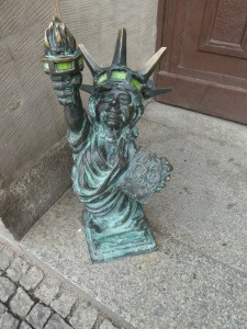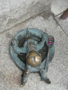 Et bien sûr, comme tout bon touriste à Wroclaw, j’ai fait la chasse aux gnomes, j’en ai sûrement loupés et je ne suis pas passée partout, mais dans toute la ville, des gnomes (en bronze ou en cuivre, je crois) sont installés, il y a en 150 et l’office du tourisme vend des plans pour tous les trouver. C’est un symbole de l’alternative orange des années 1980, pour dérider les communistes et pour la liberté et encourager la pensée libre.