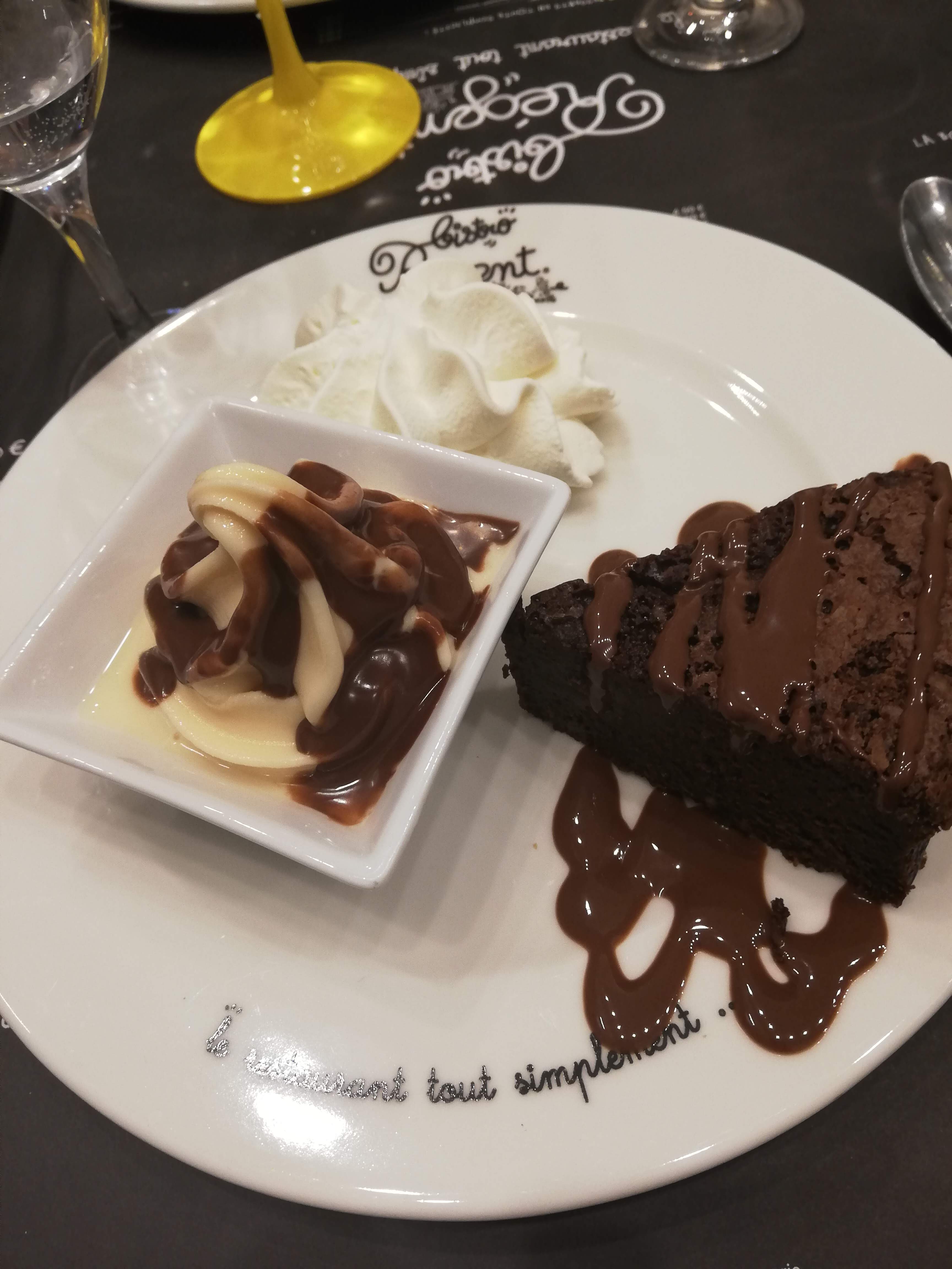 Dans mon dernier article, je m’étais arrêtée au déjeuner. Une amie qui n’a pas pu venir nous a tout de même recommandé le restaurant Le Régent près du centre commercial Saint-Sébastien. Une décoration sobre et moderne avec des photos de la ville, un accueil et service sympathique. La carte est restreinte, pas d’entrées, un choix entre trois viandes et deux poissons si mes souvenirs sont bons, tous servis avec une sauce légumes grillés et gingembre, ainsi que des frites et de la salade à partager. J’ai pris un magret de canard, mais sans sauce, bien rosé, c’était bien bon, l’amie qui a pris la même chose (mais avec sauce) était du même avis et celle qui a pris le saumon (un tartare je crois) était aussi satisfaite. Pour le dessert, je me suis fait plaisir avec le délicieux gâteau au chocolat de mamie et les filles ont pris un café gourmand de la mort : les mignardises étaient pas si petites, avec même une profiterole. Sympa. Excellent repas, bon service, prix corrects, à refaire, je ne peux que recommander !