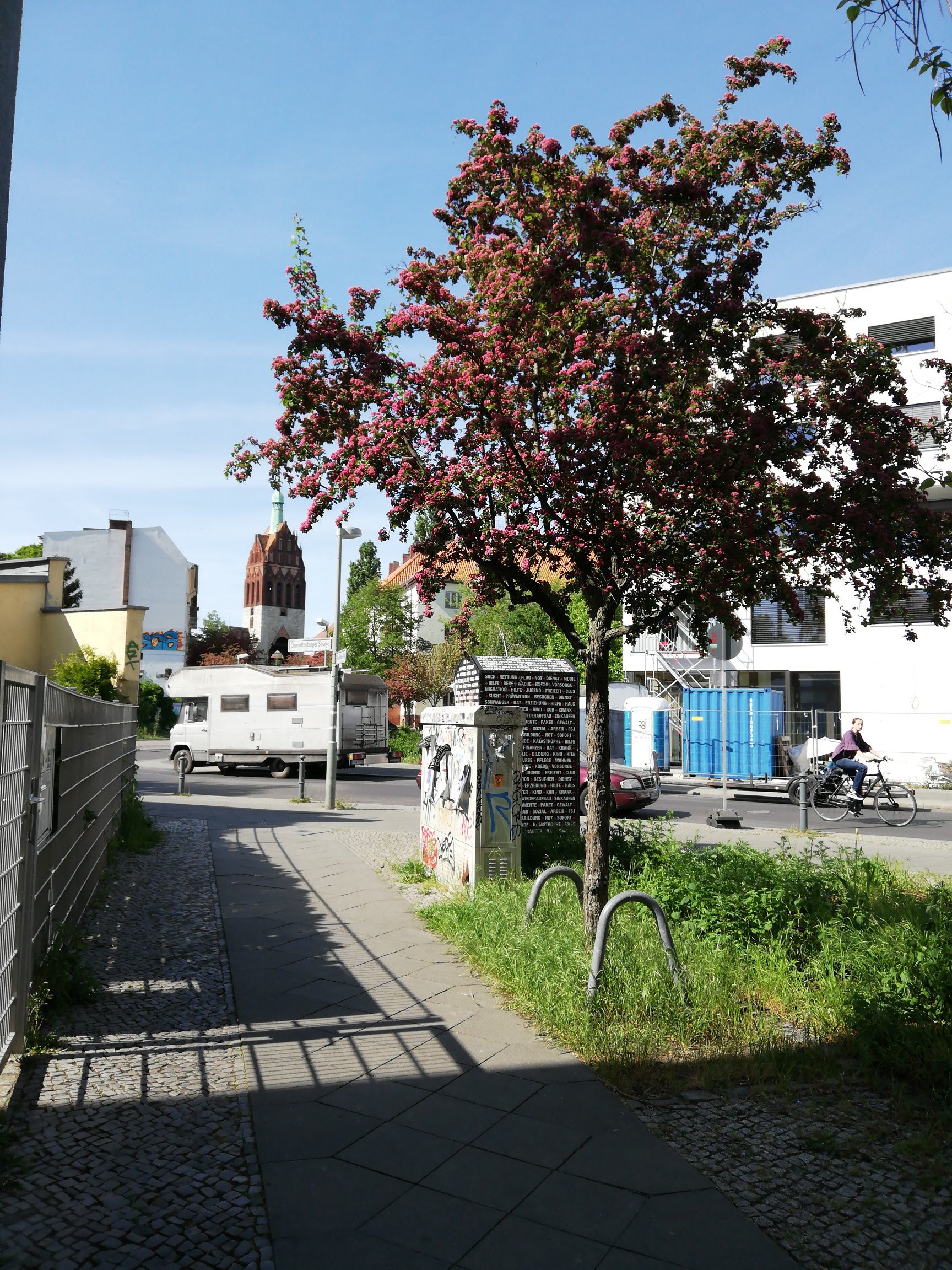 Le jeudi de l’Ascension après une petite journée de travail, je suis allée me promener dans le sud de l’arrondissement, sous le soleil. Le départ sur Antonplatz à Weissensee, je prends la rue Max-Steinke-Strasse jusqu’à Mirbachplatz avec sa jolie église qui semble à l’abandon. Puis je continue sur la rue Gäblerstrasse, déserte en ce jour férié, jusqu’à tomber sur Roeckelstrasse, là, je pénètre dans l’ensemble de jardins Frieden, où les visiteurs sont les bienvenus aux heures d’ouverture et peuvent même se servir en fruits et légumes si ceux-ci se trouvent dans des récipients à l’extérieur des jardins… C’est très vert et fleuri, ça donnerait presque envie d’avoir son
