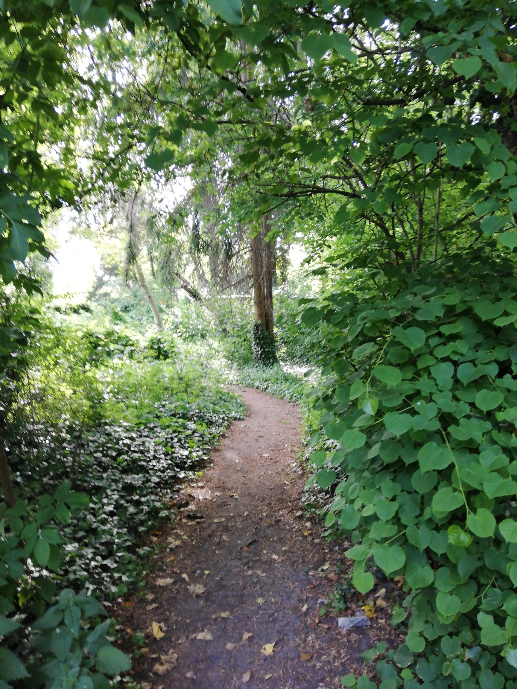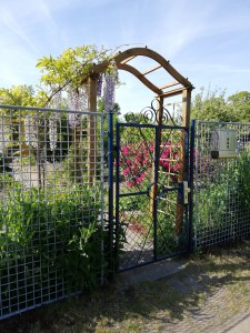 Je continue donc mon chemin, la rue est arborée, c’est assez joli, à un moment mon application Komoot me dit de tourner sur Thiesstrasse vers Günther-Liftin-Strasse, car il y aurait un mémorial de la première victime du mur, mais non, rien. En recherchant plus tard, il y a bien un mémorial Günther Liftin mais dans le quartier de Mitte… Bref, je fais donc demi-tour pour retourner sur Gäblerstrasse jusqu’à arriver à l’entrée d’un ensemble de jardins, là aussi ça sent bon les fleurs. J’emprunte le chemin C Weg, un petit coin vert agréable à traverser qui me mènera à l’arrière d’un grand magasin en bord de route