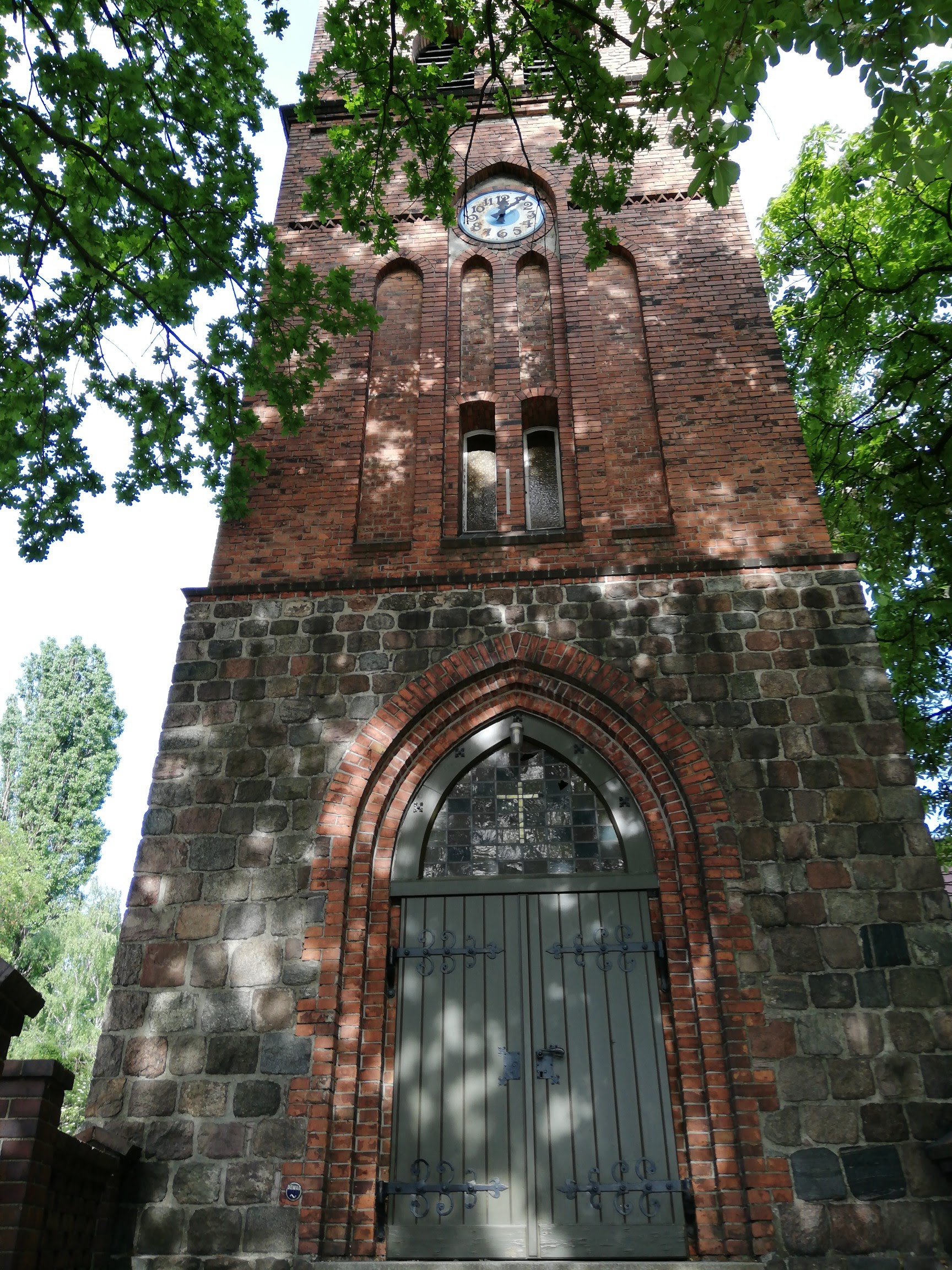 départementale, me voilà dans le quartier de Heinersdorf. De là, je remonte la rue Romain-Rolland-Strasse jusqu’à l’église « du village » (Dorfkirche Heinersdorf, Dorf voulant dire village, ce qui laisse penser que Berlin s’est étendue en avalant des villages), sur le chemin je croise l’ancienne caserne des pompiers et une belle maison abandonnée, je trouve ça tristement beau (mais je n’oserais pas y rentrer, si jamais il y avait des anges pleureurs…). Après avoir jeté un œil de l’extérieur à l’église abritée par des arbres, j’ai descendu la rue Tino-Schwierzina-Strasse vers le château d’eau (Wasserturm).