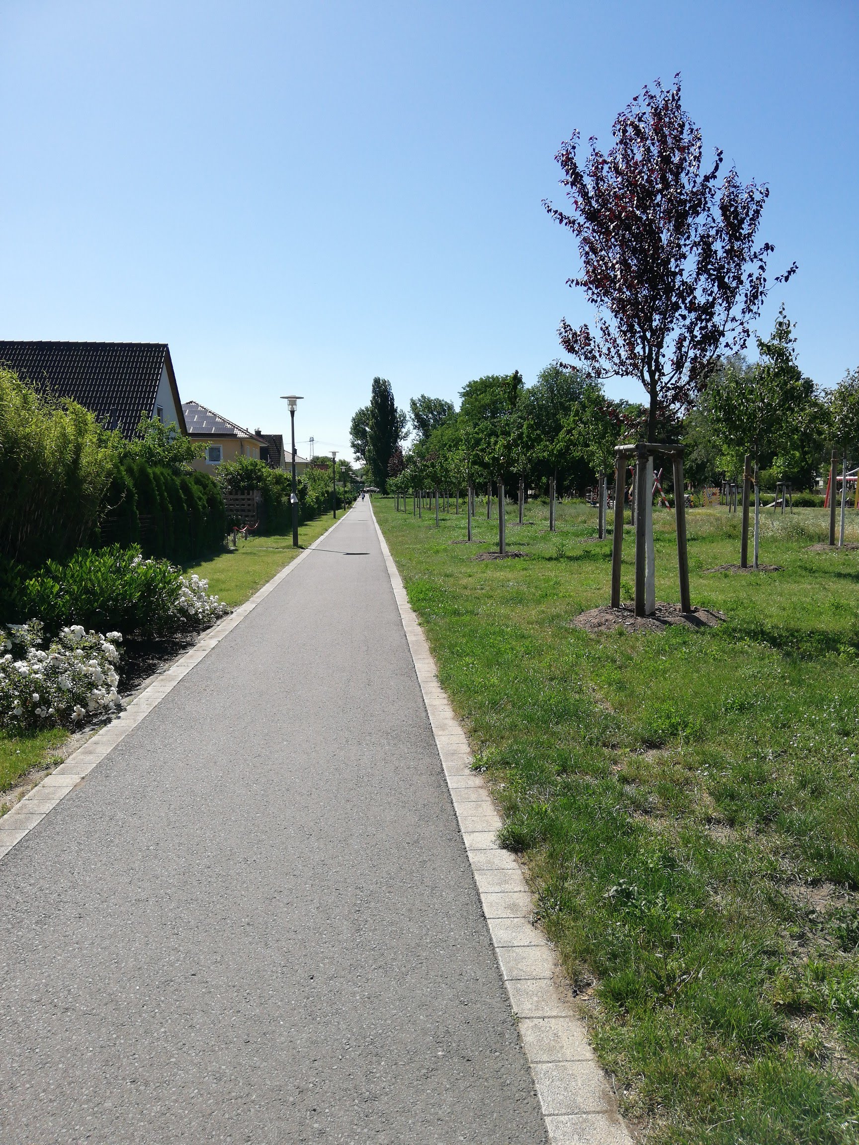 C’est vraiment un coin sympa, avec des bancs, des coins aménagés avec tables et un terrain de beach-volley, et avec le beau temps c’était rempli. À un moment, je suis arrivée à la partie plage de sable, menant directement à l’eau, à regarder la scène, on pourrait croire que Corona c’est du passé, c’était bondé. Autant dire que je ne me suis pas attardée là, d’ailleurs c’était là la fin de ma balade, j’ai ensuite remonté Beruner Strasse pour aller prendre le U5 à la station Biesdorf Süd. À l’occasion je tenterai peut-être le tour complet du lac, je pense avoir fait environ la moitié là, mais comme du travail m’attendait à la maison, et que le trajet est assez long, je n’ai pas voulu trop prolonger la balade, si agréable fût-elle.